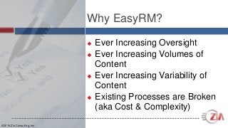 Easy RM from Zia, powered by Alfresco, automates the RM process. Easy RM creates complete file plans with retention and disposition schedules directly from actions in accounting/ERP or CRM systems like SAP, Salesforce, or Microsoft Dynamics. Additionally, our solutions are built on a single DoD5015.02 certified content hub for document and records management, delivering enterprise-class reliability and scalability.