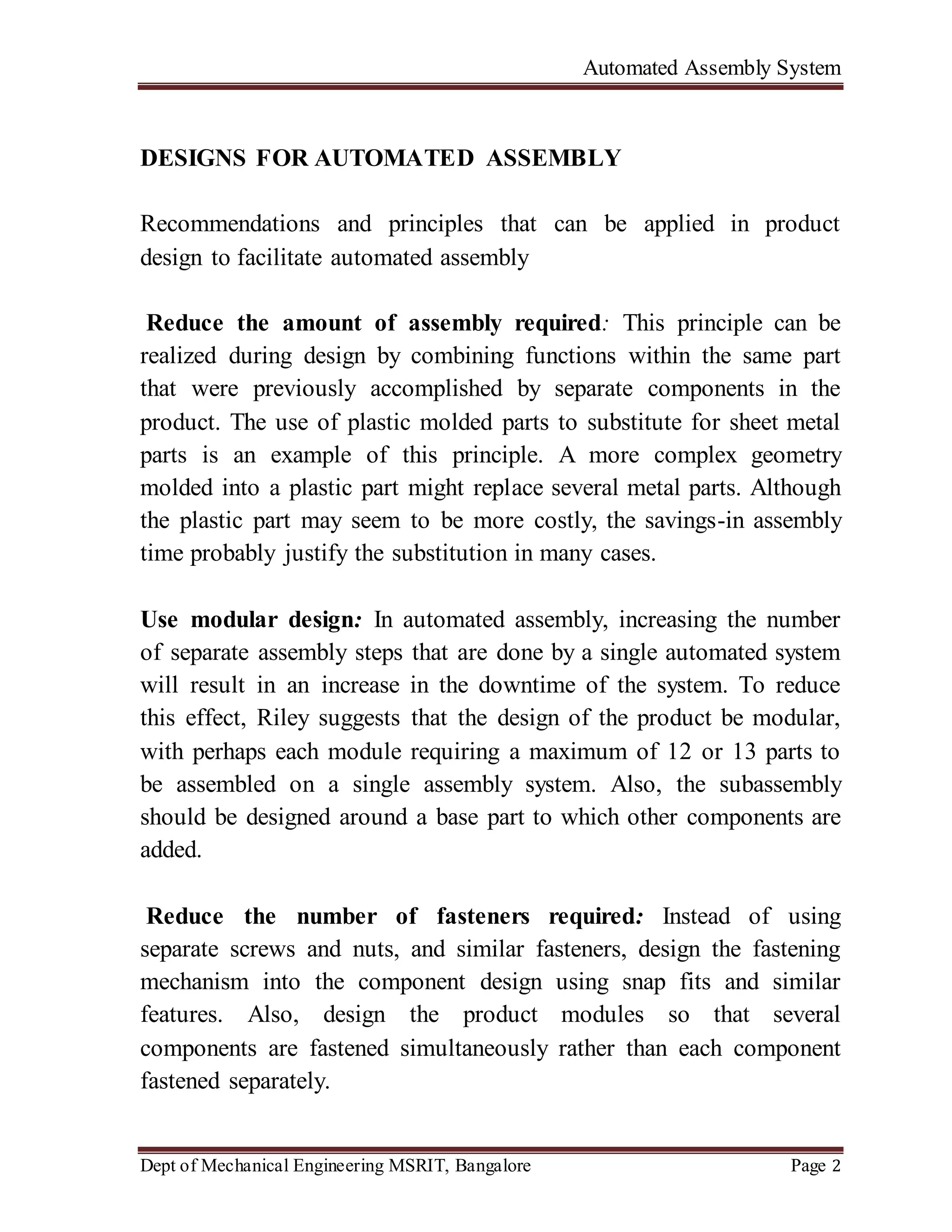 The document discusses the automated assembly systems used in manufacturing, emphasizing the principles of design that facilitate automation, such as modular design, reducing the number of fasteners, and ensuring high quality components. It outlines various types of assembly systems and the importance of optimization for cycle time in automotive manufacturing, highlighting a case study that successfully increased production efficiency. Additionally, advancements such as robotic systems for wheel loading and the application of visual servoing and force control are explored as vital to improving assembly processes.