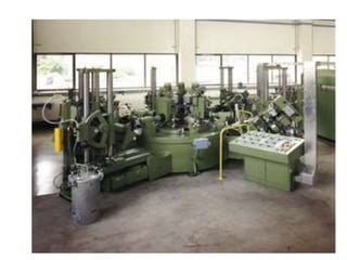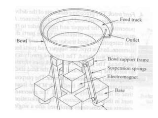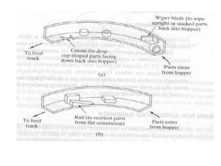 The document discusses automated assembly systems. It describes how automated assembly involves using mechanized devices to join parts together on an assembly line. There are different types of automated assembly systems like dial-type, in-line, carousel, and single-station machines. The document also discusses factors to consider for automated assembly like product demand, design, and component size. It outlines principles for designing products for automated assembly and describes common part feeding devices used like hoppers, feeders, tracks, and escapement/placement mechanisms.