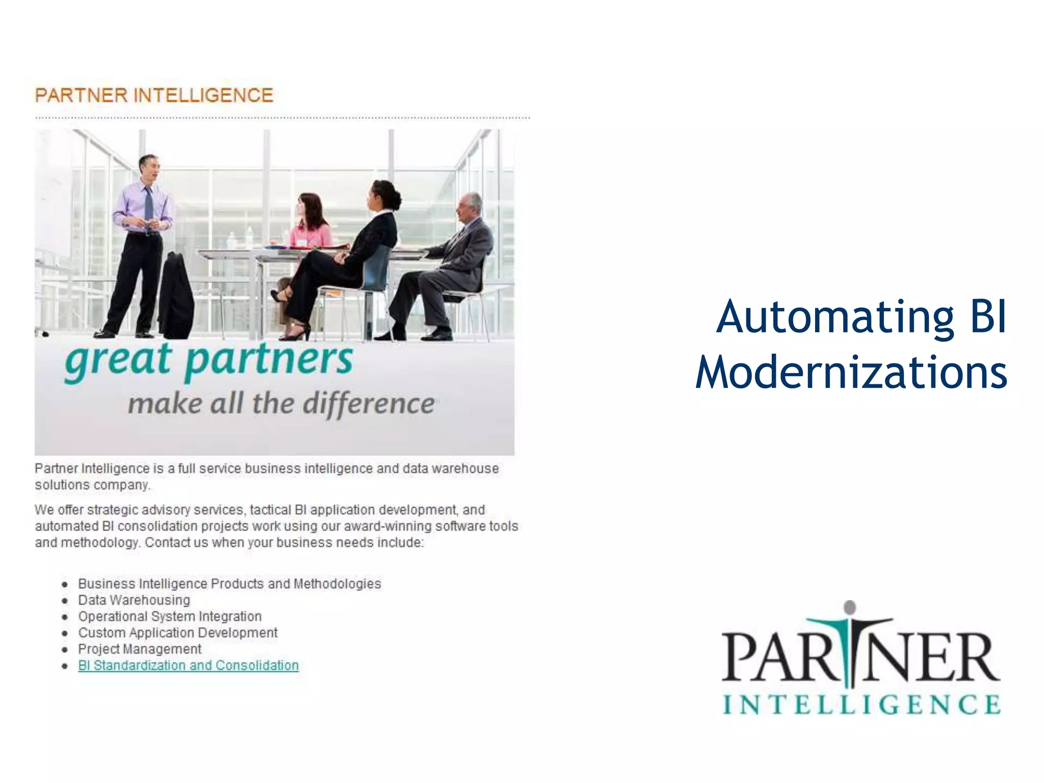 Partner Intelligence offers consulting services for organizations utilizing or considering business intelligence (BI) software, focusing on strategic advice, application development, and modernization of legacy BI systems. Based in Cincinnati, the company serves North America, particularly in the Midwest, and addresses client challenges such as stalled BI initiatives and the need for expertise in application development. Their proprietary BI modernization tools, including a workbench with various analytical components, facilitate efficient project execution and management.