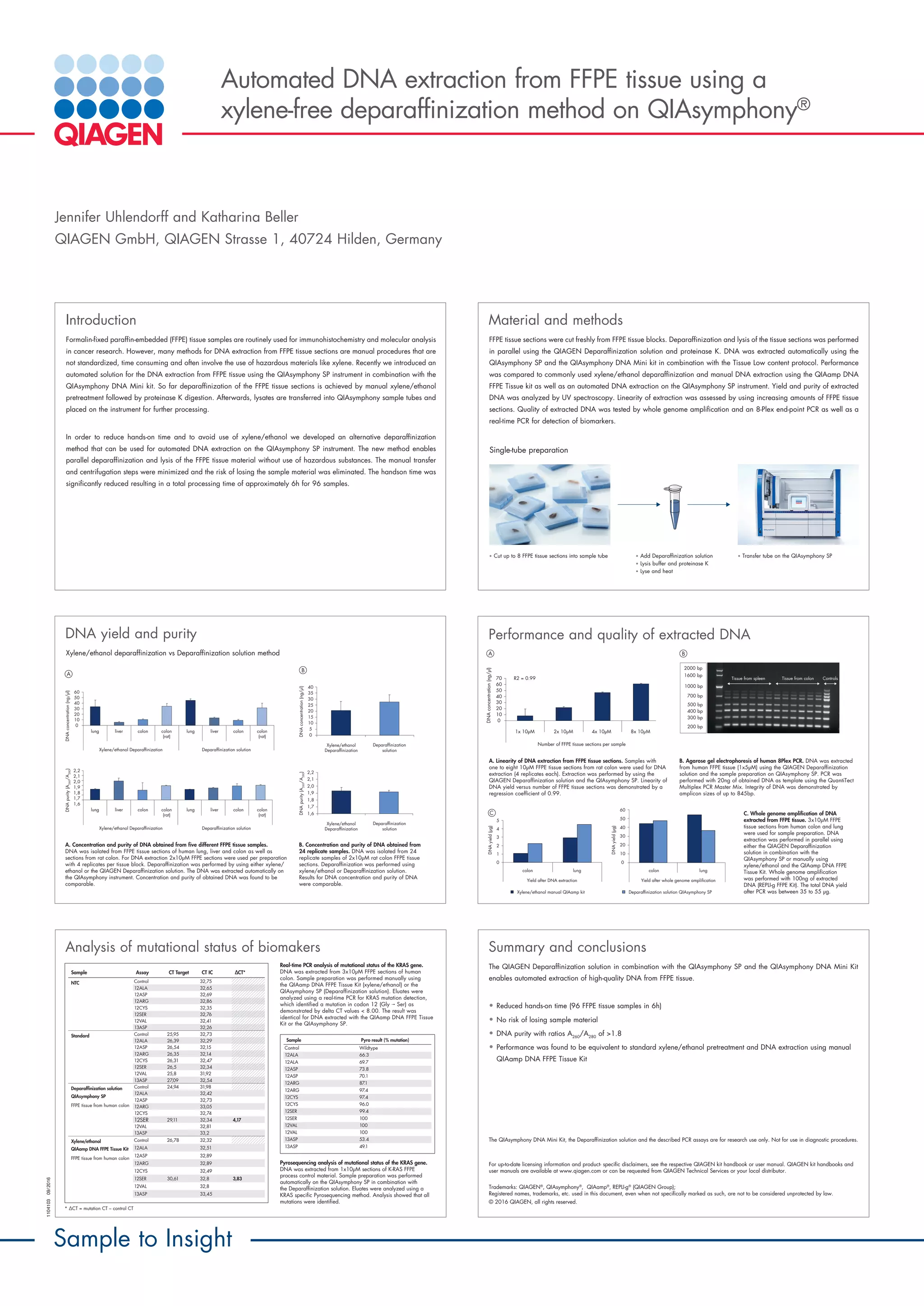 An automated deparaffinization and DNA extraction method using the QIAsymfony SP instrument and QIAGEN deparaffinization solution significantly improves the processing of FFPE tissue samples by reducing hands-on time and eliminating hazardous substances like xylene. The method yields high-quality DNA with purity ratios comparable to traditional methods while minimizing sample loss. Overall performance was validated through successful whole genome amplification and mutation detection via various PCR assays.