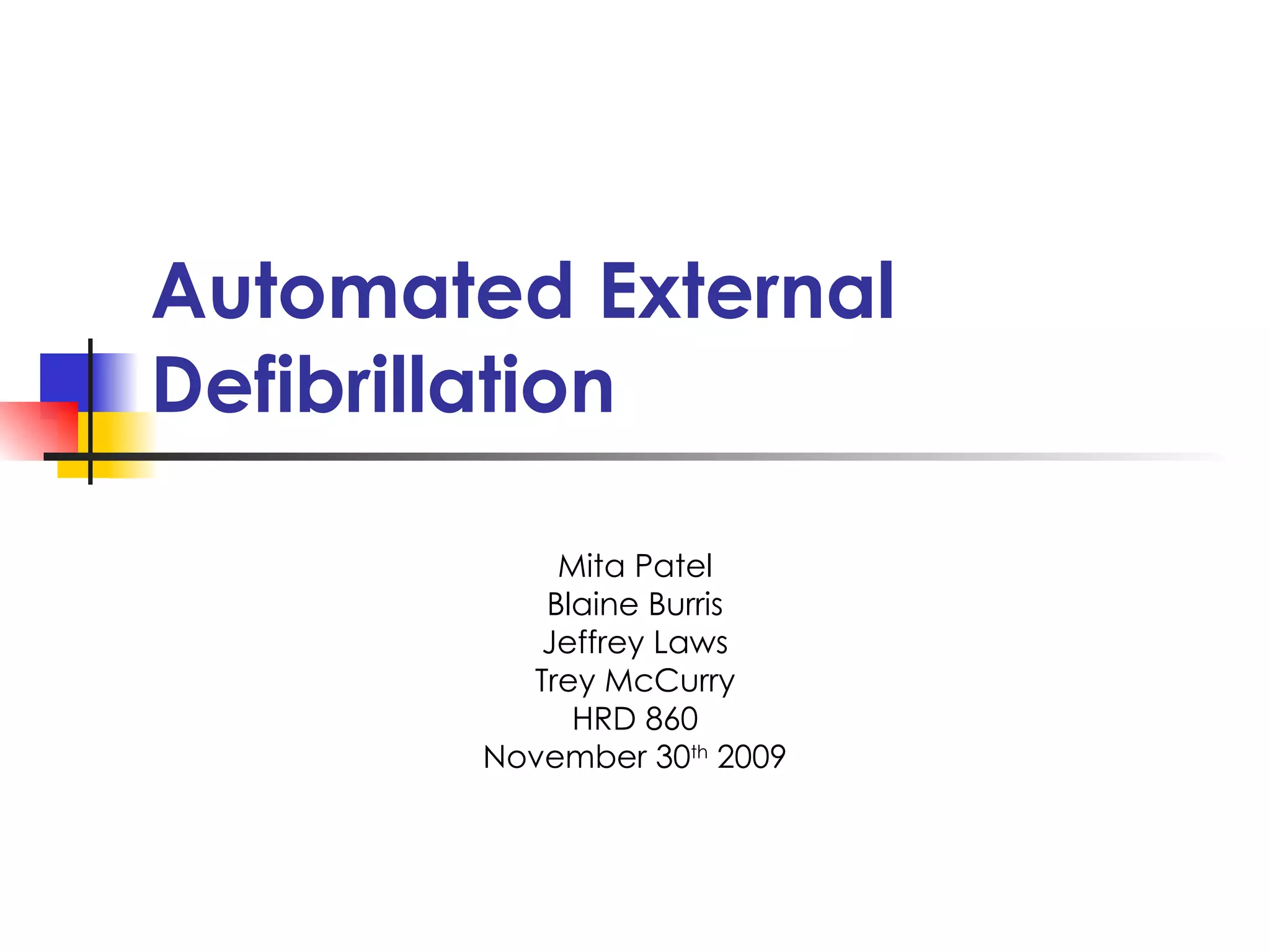 The document discusses how to respond in an emergency situation requiring an automated external defibrillator (AED). It provides instructions on performing an initial assessment of an unconscious victim, calling 911, administering CPR, retrieving an AED, and using the AED to analyze the victim's heart rhythm and deliver a shock if needed. The objectives are to teach students to properly use an AED through a demonstration using mannequins and to test their abilities in a clinical setting.
