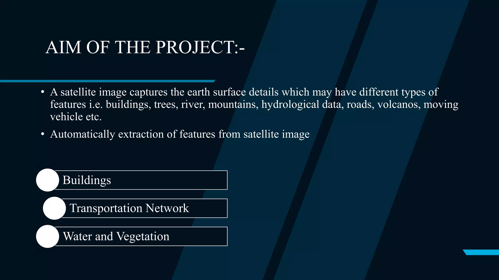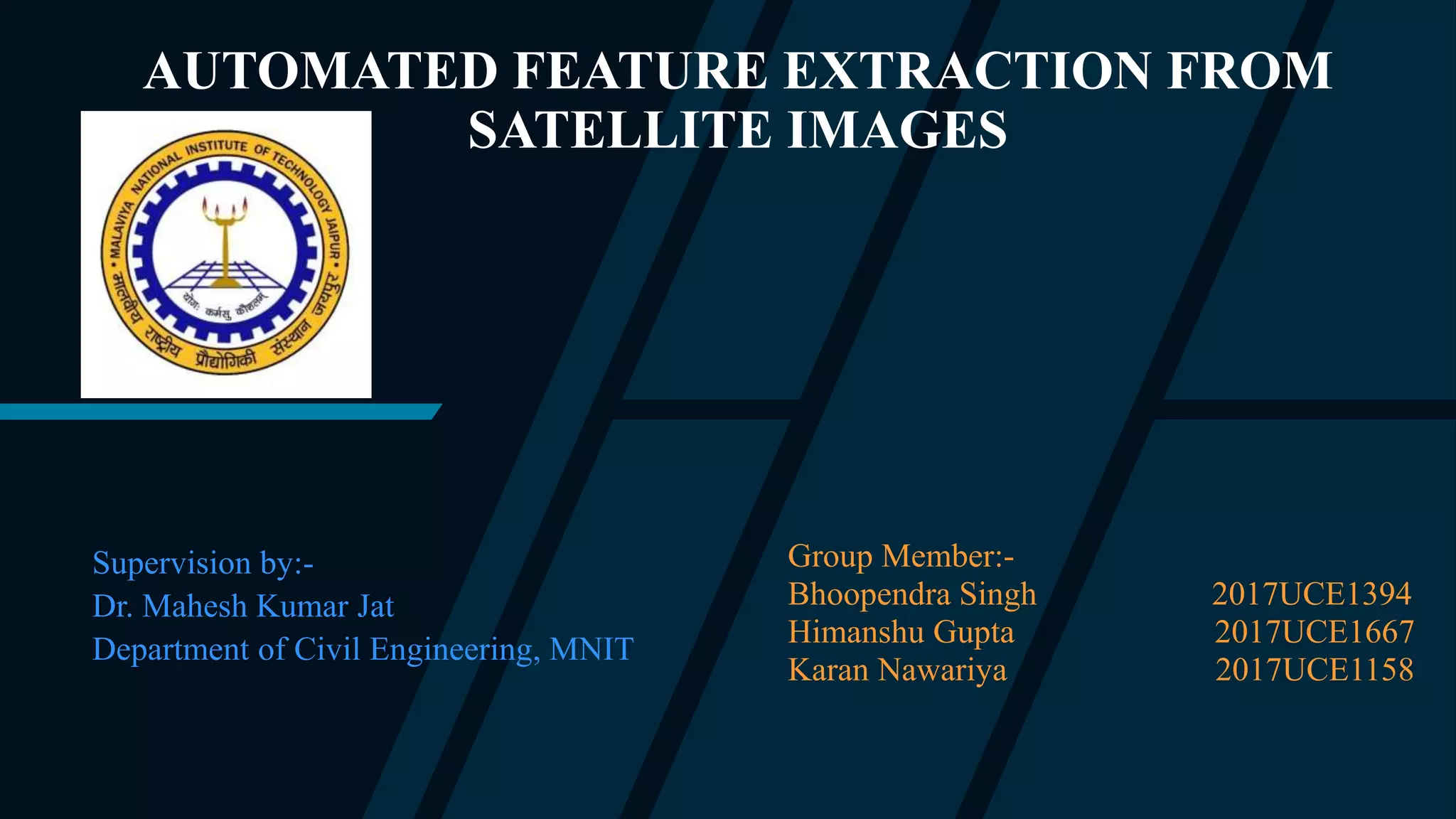 This document outlines a project focused on the automated extraction of features from satellite images using eCognition software to classify land use types such as buildings, roads, and vegetation. The methodology involves segmentation, classification, and the application of a nearest neighbor algorithm to enhance accuracy, while also addressing limitations caused by small sample sizes and computing power. The findings indicate successful feature extraction despite challenges, with recommendations for improving the classification process.