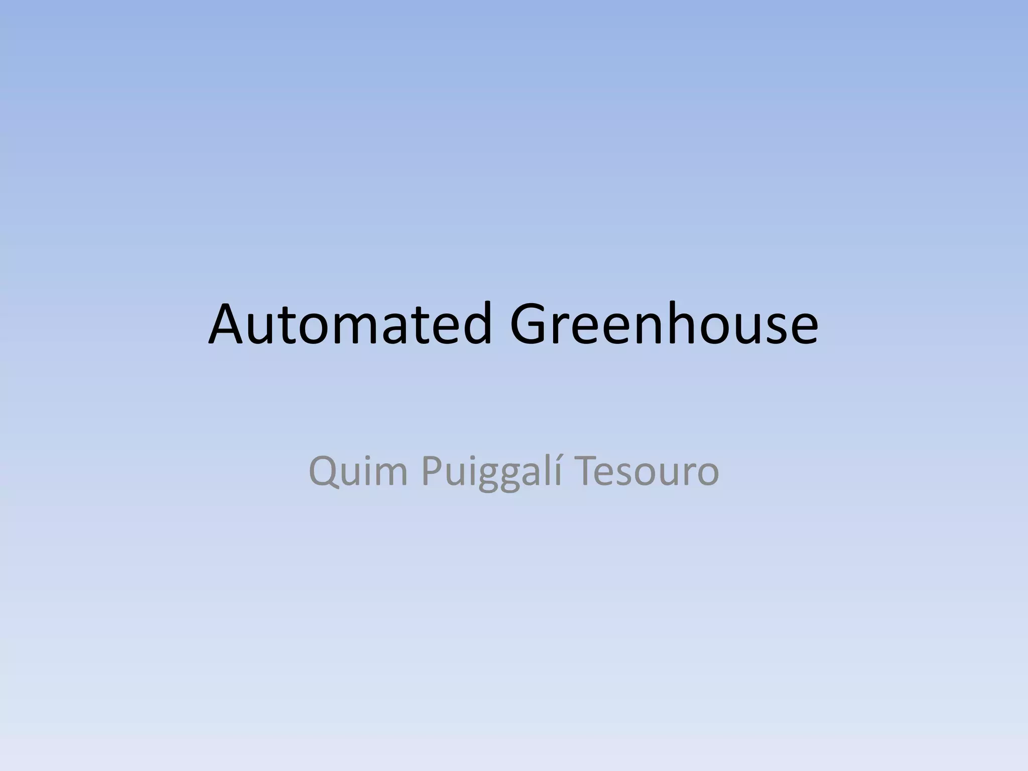 This document outlines an automated greenhouse project. The student aimed to learn about automation and control systems by automating a greenhouse. They bought sensors and components, learned about programming microcontrollers, and created code to automate and control the greenhouse's temperature, humidity, watering and lighting systems. The document is structured to explain the motivation, methodology, components used, and programming implemented to complete the automated greenhouse.