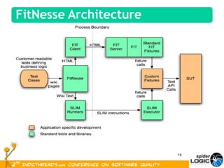 The document discusses the Selenesse framework, an automated keyword-driven testing tool that integrates Selenium with FitNesse, enabling users to define automated tests in a tabular format. It highlights the advantages and challenges of using this framework, such as ease of use and collaboration, but also notes limitations like lack of support for large projects and the requirement for multiple servers. Additionally, it describes the scripting capabilities, architecture, and the community support available for users.