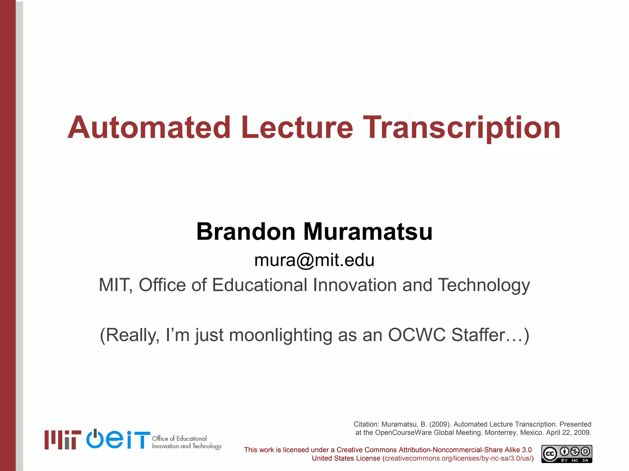The document discusses the development of automated lecture transcription technology by Brandon Muramatsu at MIT, highlighting the increasing need for accessible academic videos and the challenges of recognizing spoken lecture content. It outlines the goals of the Spoken Lecture Project, which aims to facilitate finding specific content in videos and improving search and retrieval of lecture materials. Additionally, it touches on potential partnerships and service models for creating a robust transcription service while acknowledging current limitations in accuracy and language support.