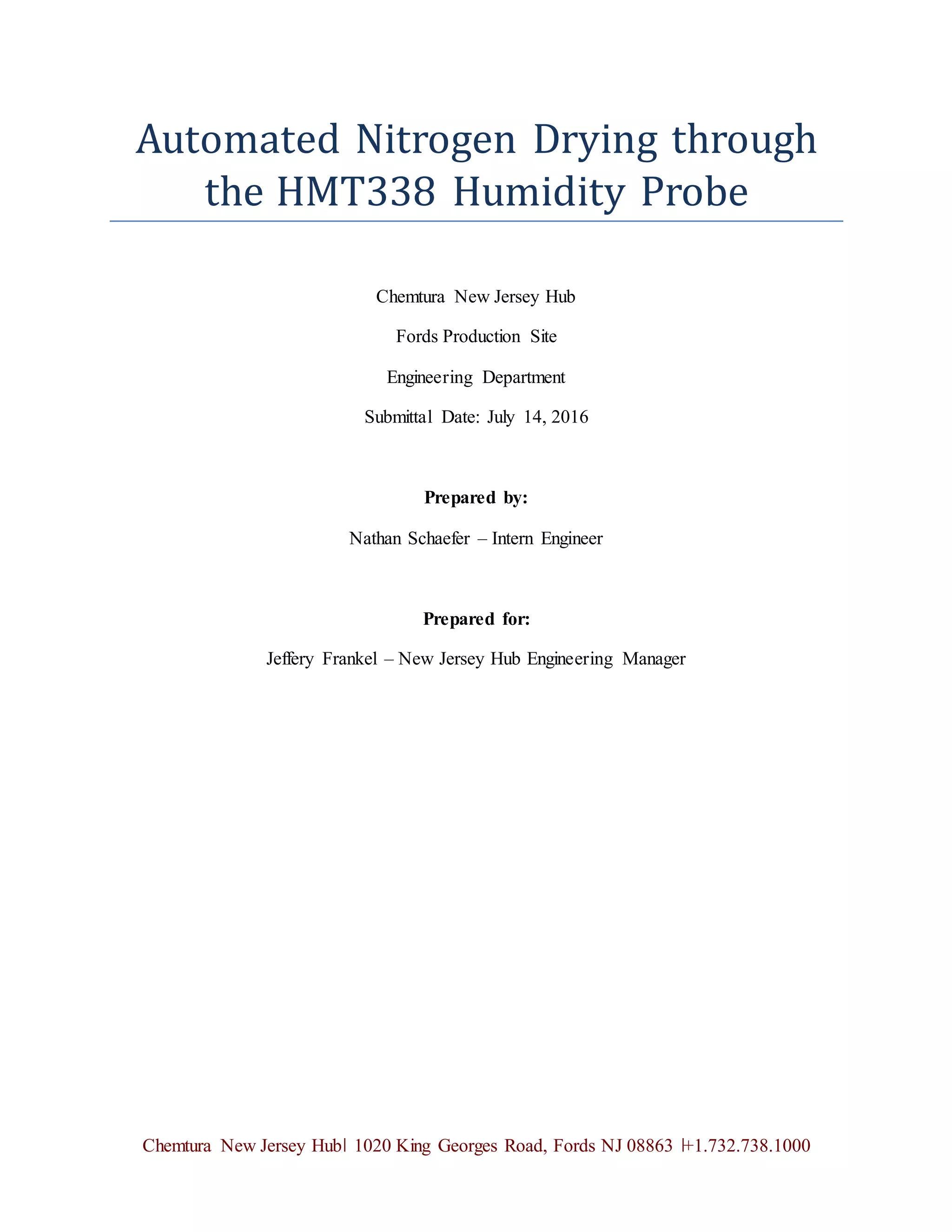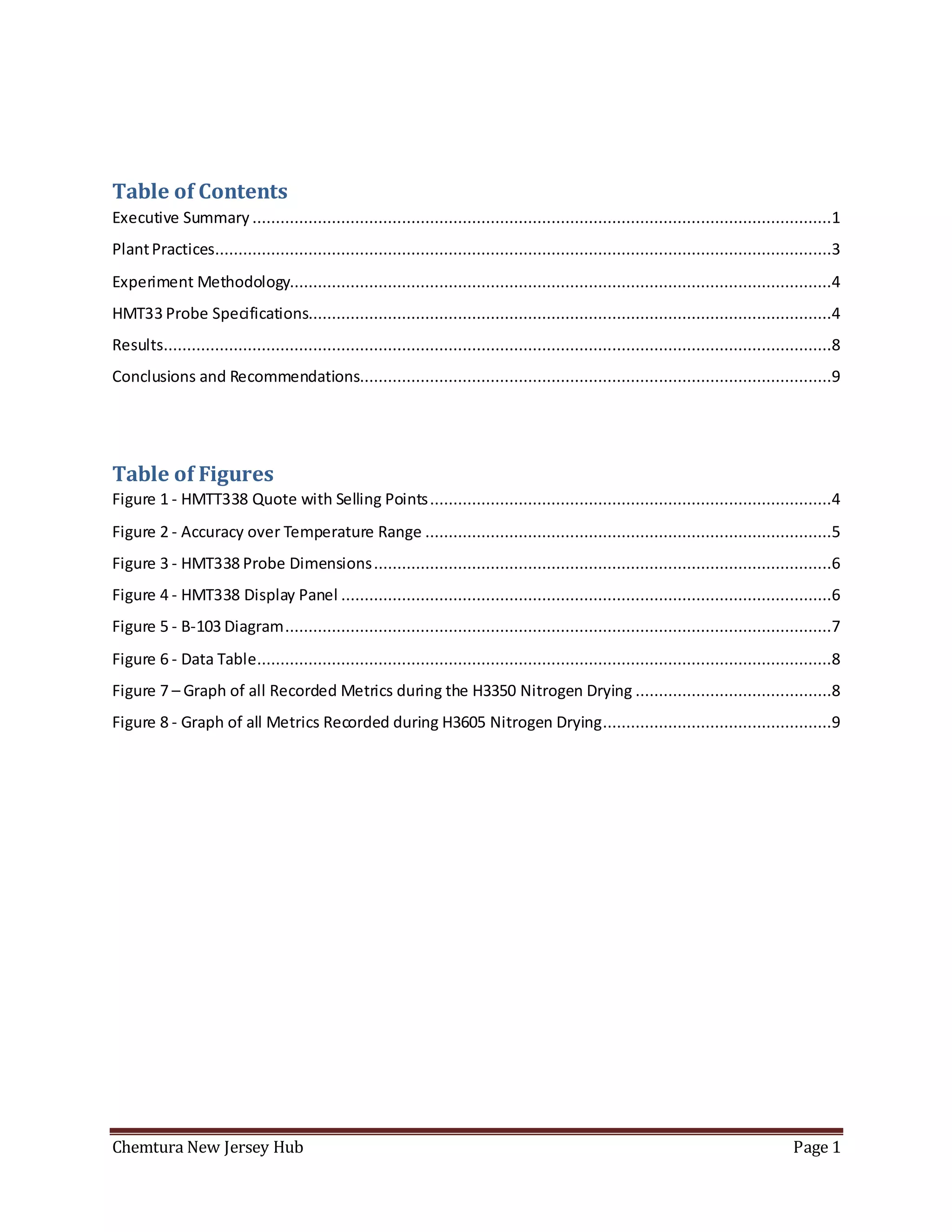 The document summarizes an experiment using a HMT338 humidity probe to attempt to correlate vapor humidity readings from nitrogen drying of specialty ester batches with product moisture content measurements. No clear correlation was found due to confounding factors like sample exposure to atmosphere introducing moisture and humidity-dependent lab testing methods. Recommendations include investigating inert sampling methods, locking down tanks on weekends to minimize nitrogen use, and purchasing more reliable moisture testing equipment.