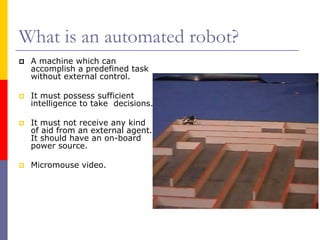 A robot requires sensors, a microcontroller, motors, and a power source. Sensors like LDRs and phototransistors provide input to the microcontroller. The microcontroller processes the input and controls actuators like DC motors through motor drivers. Stepper motors provide accurate movement but require more complex control sequences. The document discusses various sensors, motors, and motor interfaces that can be used to build an automated robot.