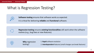 Regression testing ensures existing functionalities still work when the software