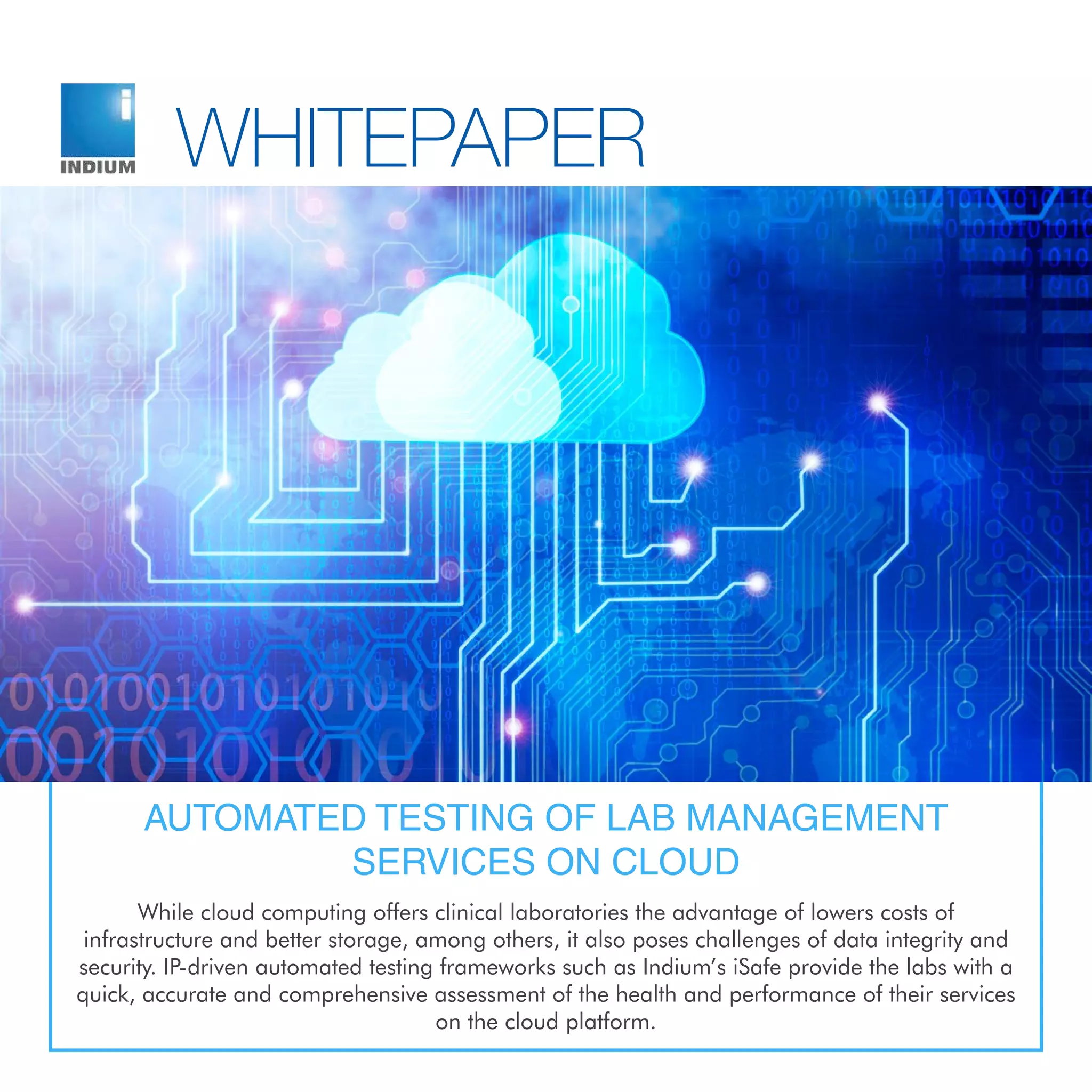 Cloud computing offers clinical laboratories reduced infrastructure costs and improved data management, but raises concerns about data integrity and security. The healthcare industry is embracing cloud technology for its scalability, cost-effectiveness, and ability to enhance collaboration, projected to reach a significant market value by 2020. However, effective testing strategies are necessary to ensure functionality, security, and performance in cloud-based laboratory management systems.