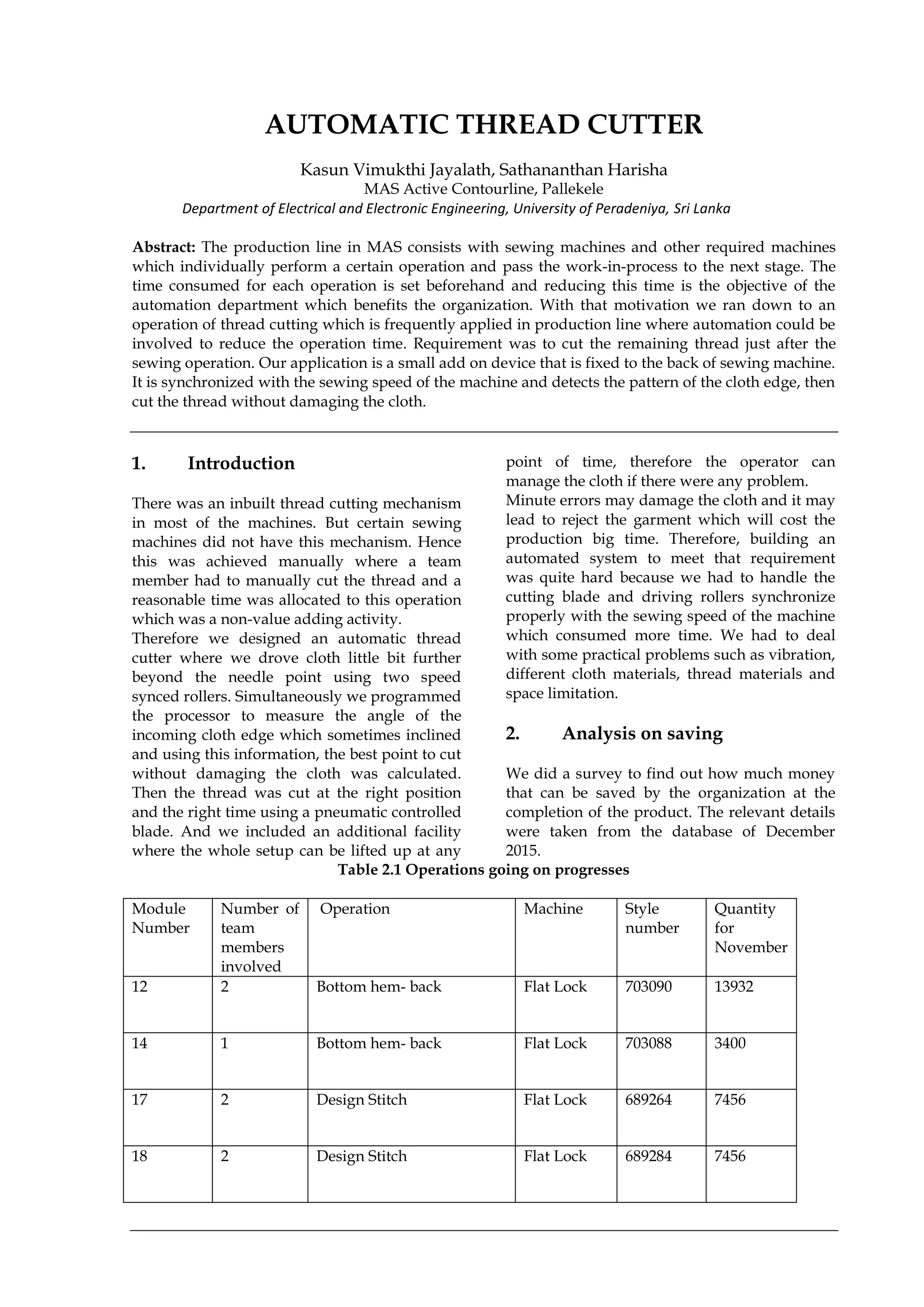 The document describes an automatic thread cutter device designed to reduce non-value adding time in a garment production line. It attaches to the back of sewing machines and uses infrared sensors and rollers synchronized to the sewing speed to detect the cloth edge and cut threads without damaging garments. Testing showed it could cut threads within 10mm of the desired distance from the edge for different cloth types and angles. Implementing this automatic device was estimated to save over 90 hours and $495.70 per month by eliminating manual thread cutting time.