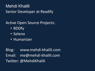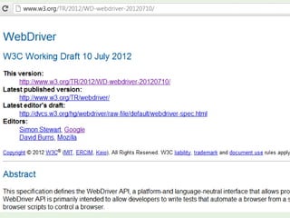 This document discusses best practices for automated UI testing. It recommends using page object models to organize tests and break pages into smaller page components. Tests should be strongly typed using view models for pages. Following principles like DRY, SRP and YAGNI can help avoid duplication and keep tests maintainable. Tests should run frequently to catch breaks early. Overall, UI testing is challenging but doing it right by applying these practices can help maximize value and avoid wasted effort.