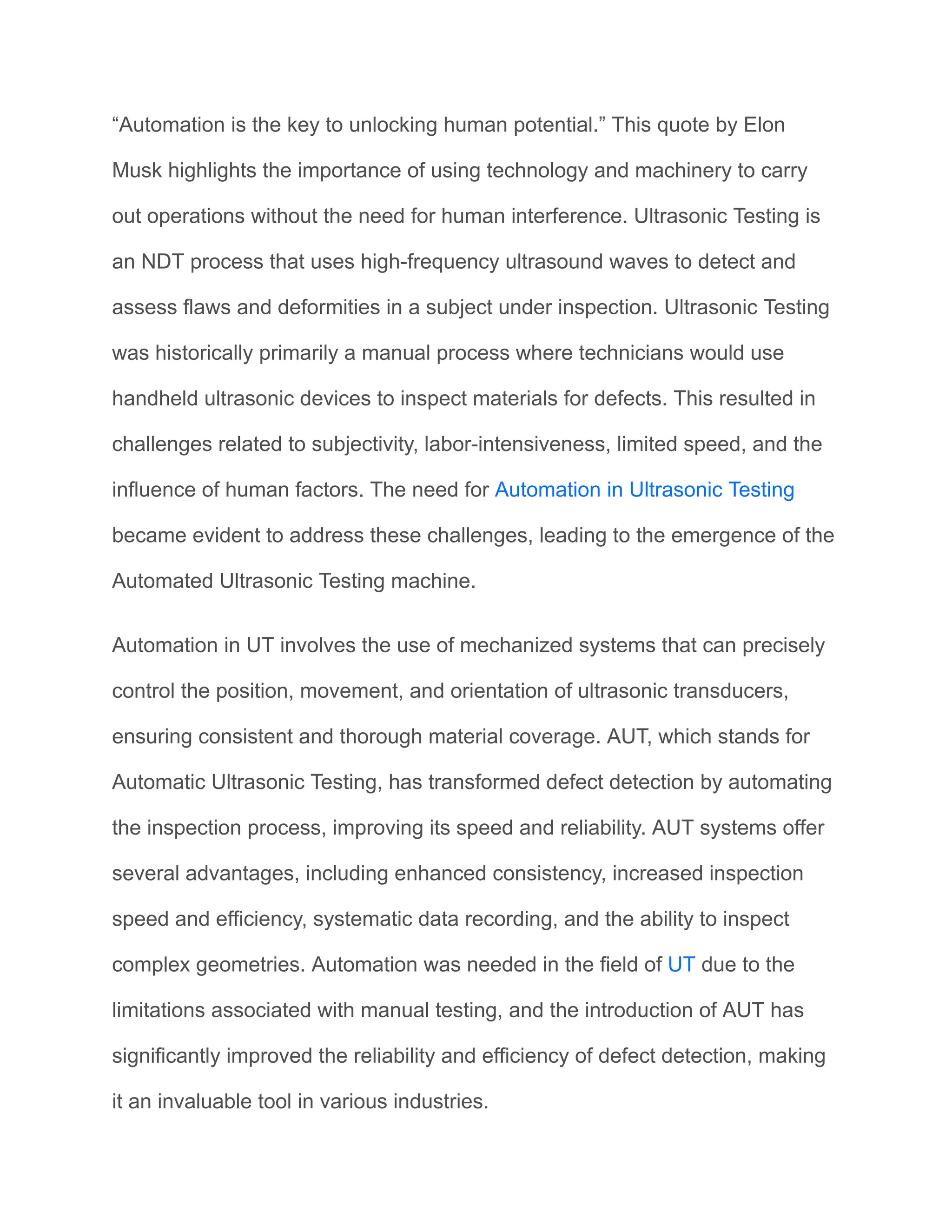 Automated Ultrasonic Testing (AUT) is an advanced nondestructive testing (NDT) technique that utilizes automated systems and robotic scanning devices to detect defects in materials more efficiently than traditional manual ultrasonic testing. The key advantages of AUT include improved inspection speed, accuracy, and consistency, while its disadvantages can include higher initial costs and complexity in implementation. Various techniques such as Phased Array Ultrasonic Testing and Remote Operated Ultrasonic Testing are employed in AUT, making it versatile across industries like oil and gas and aerospace.
