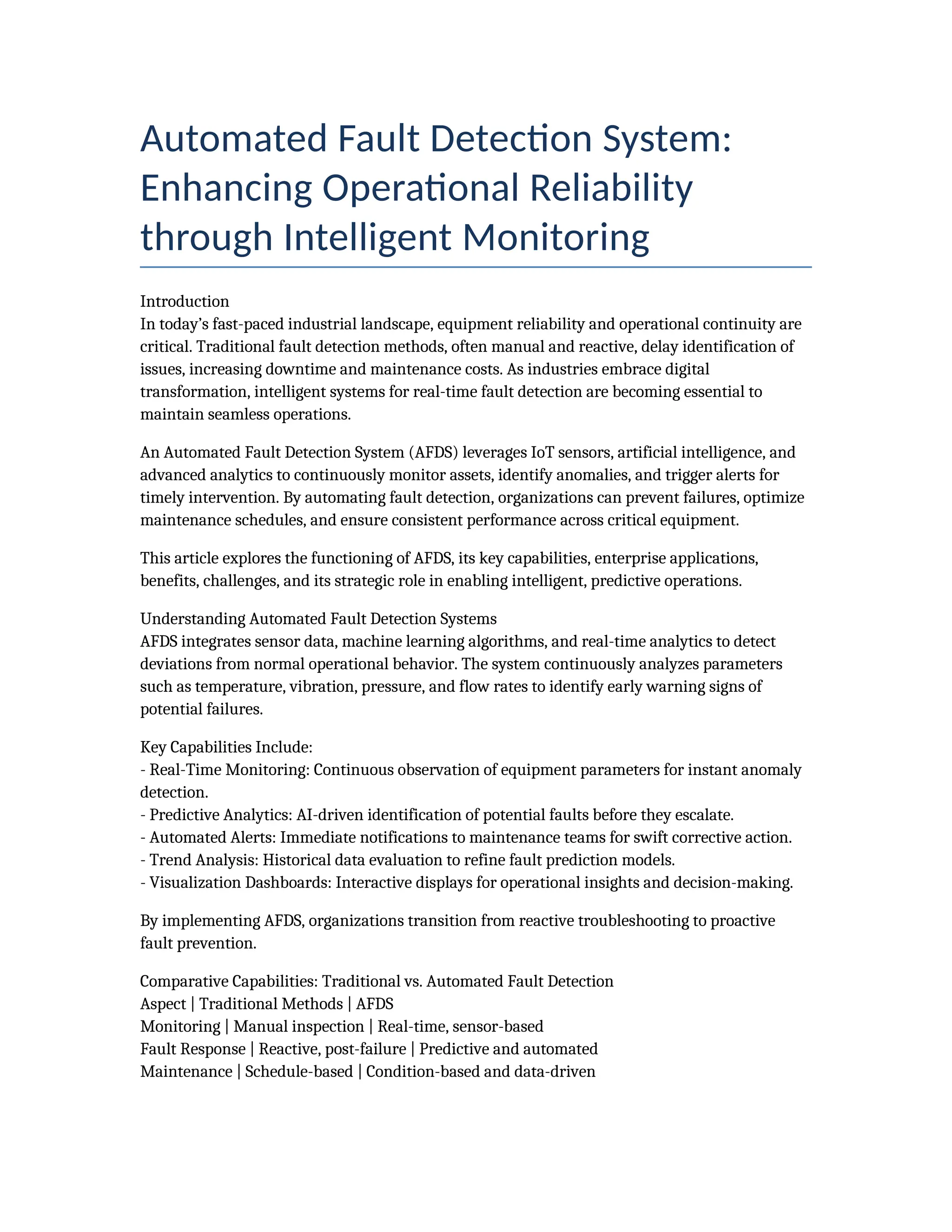An Automated Fault Detection System (AFDS) leverages IoT sensors, artificial intelligence, and advanced analytics to continuously monitor assets, identify anomalies, and trigger alerts for timely intervention. By automating fault detection, organizations can prevent failures, optimize maintenance schedules, and ensure consistent performance across critical equipment.