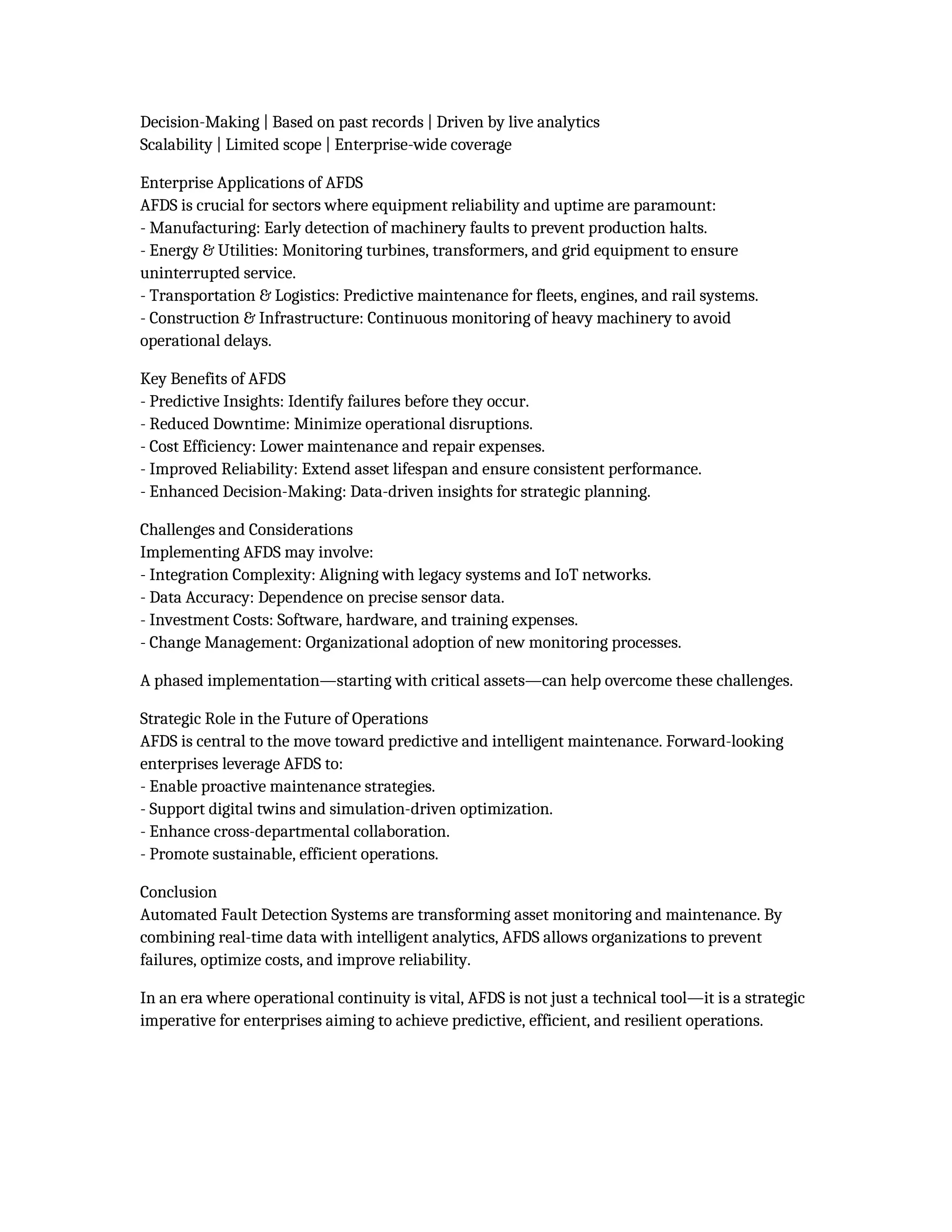 This article explores the functioning of AFDS, its key capabilities, enterprise applications, benefits, challenges, and its strategic role in enabling intelligent, predictive operations.