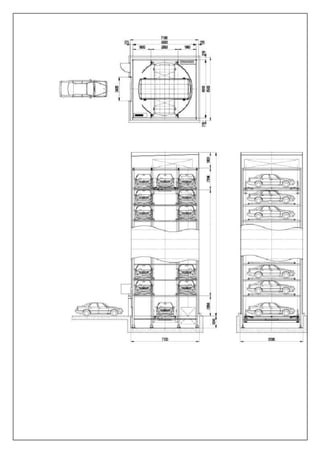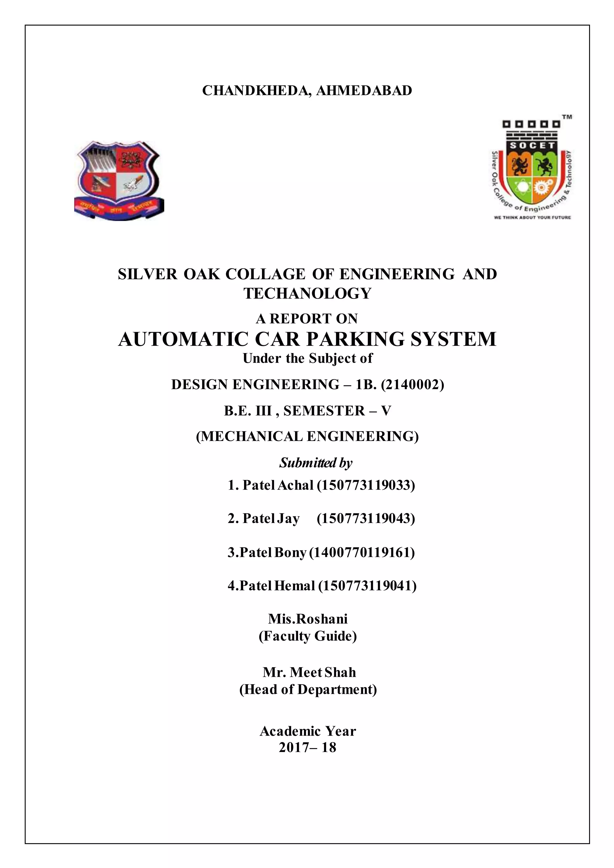 This document is a report on an automatic car parking system created by four students at Silver Oak College of Engineering and Technology in Ahmedabad, India. It includes sections on the theory of the project, types of car lifts and parking systems, advantages and disadvantages of multi-story car parking, a table of contents, acknowledgements and list of figures. The project uses an 8051 microcontroller to automatically open and close a gate and track vacant spaces in a multi-level parking system using IR sensors.
