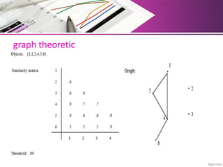 The document discusses automatic classification methods used in information retrieval, including clustering techniques and measures of association. It outlines various classification methods, their applications, and the importance of clustering in improving retrieval efficiency. Additionally, it explores the theoretical foundations and algorithms related to clustering, such as the single-link method and minimum spanning tree concepts.