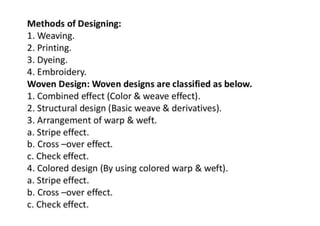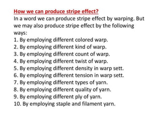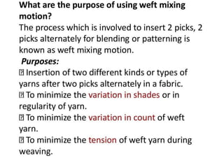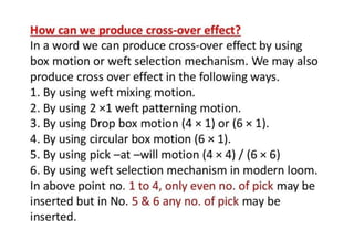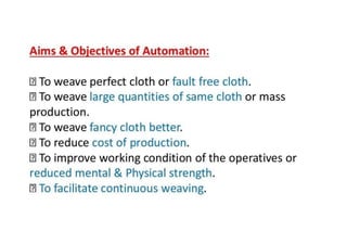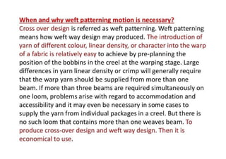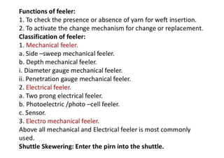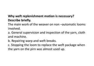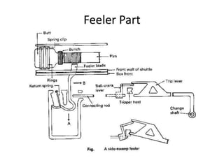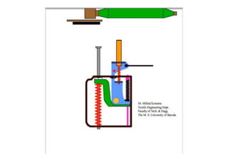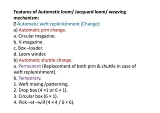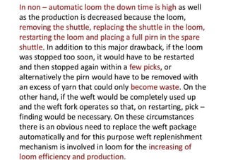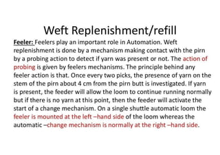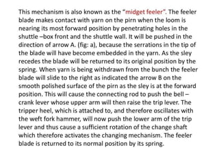 The document summarizes the working principle of the changing mechanism on an automatic conventional weaving loom. It describes that when the feeler detects there is no yarn left on the pirn, it causes a slight rotation of the changing shaft. This engages the bunter, which pushes the bunter lever and presses the pirn with a hammer to change it. The new full pirn is then positioned in the shuttle from the circular magazine mounted on the right side of the loom, which can hold 24-30 pirns.