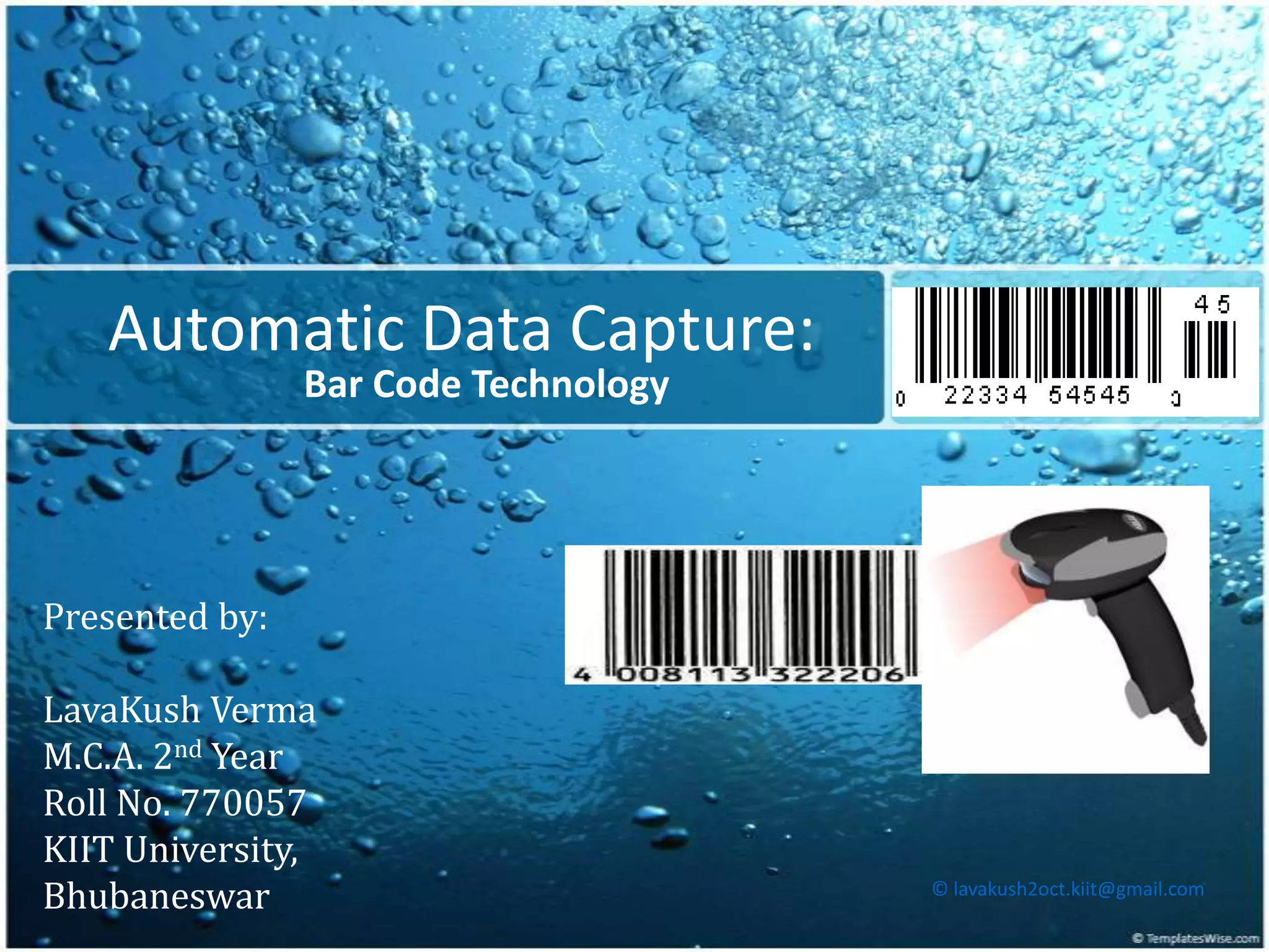 This document discusses automatic data capture using bar code technology. It defines automatic data capture as inputting data without typing by using bar code readers to scan encoded bar codes. The document describes the basic components of bar codes, including linear and 2D bar codes. It focuses on universal product codes (UPCs), explaining how UPC bar codes work by encoding product information and using a check digit for verification. The benefits of bar codes for accurate and efficient data collection are also summarized.