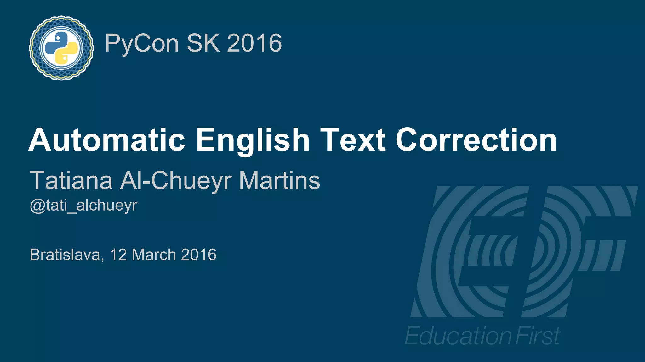 The document discusses a project led by Tatiana Al-Chueyr at EF Education First aimed at improving English essay evaluations through automated text correction tools. It outlines the challenges faced by teachers in assessing essays, introduces a large dataset of annotated learner essays, and describes the development of Python scripts that utilize heuristics to identify common mistakes such as spelling and capitalization. The presentation also touches on future improvements and the integration of user feedback to enhance the algorithm's effectiveness.
