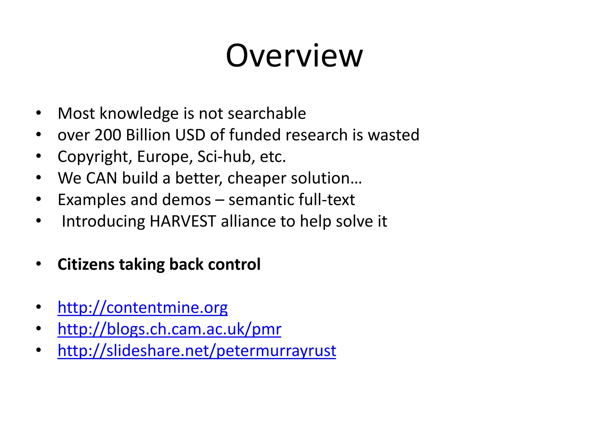 The document discusses the challenges of knowledge extraction from scholarly literature, highlighting the inefficiencies and inaccessibility of published research. It emphasizes the need for open access to scientific data and presents tools developed by the Harvest Alliance aimed at facilitating knowledge mining and reusability. The author argues that current publishing practices hinder innovation and can lead to real-world consequences, particularly in public health.