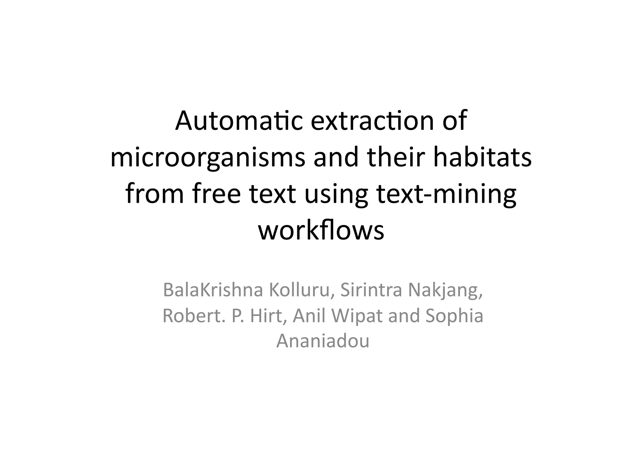 This document summarizes an approach to automatically extract microorganisms and their habitats from free text using text mining workflows. The approach uses a named entity recognizer combining dictionaries and machine learning to identify organisms and habitats. It then employs relation mining to extract sentences expressing relationships between organisms and habitats. Evaluation shows the organism recognition achieves 84% precision but habitat recognition is lower at 68% precision, limiting the relation mining performance. Ongoing work aims to improve the habitat model and make the overall approach more robust to noise from PDF to text conversion.