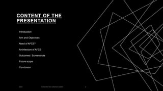 An automated fare collection (AFC) system automates ticketing and fare payment on public transportation networks. The presented system aims to provide a secure, efficient, and convenient payment method for passengers while helping operators optimize services and improve the passenger experience. It eliminates manual ticketing and reduces fraud and errors compared to traditional systems. The architecture of the presented AFC system includes use case diagrams, activity diagrams, and flowcharts showing how users can login, manage roles and access, and view transaction and schedule masters. Screenshots demonstrate features like user and role management, transaction types, and integrated payment. Future integration with RFID cards and mobile devices could allow automatic fare deduction based on travel duration.