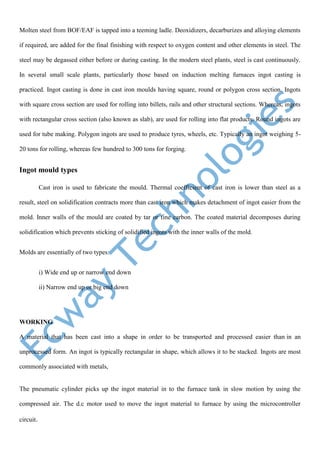 The document describes an automatic ingot feeder for furnaces. It uses two pneumatic cylinders to pick up aluminum ingots and move them slowly into the furnace tank using compressed air. A DC motor and microcontroller circuit are used to control the movement of the ingot material. The feeder aims to reduce difficult manual methods and labor previously used to load ingots.