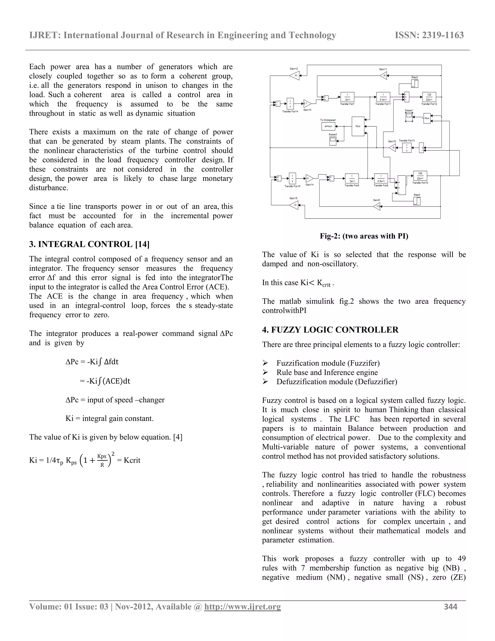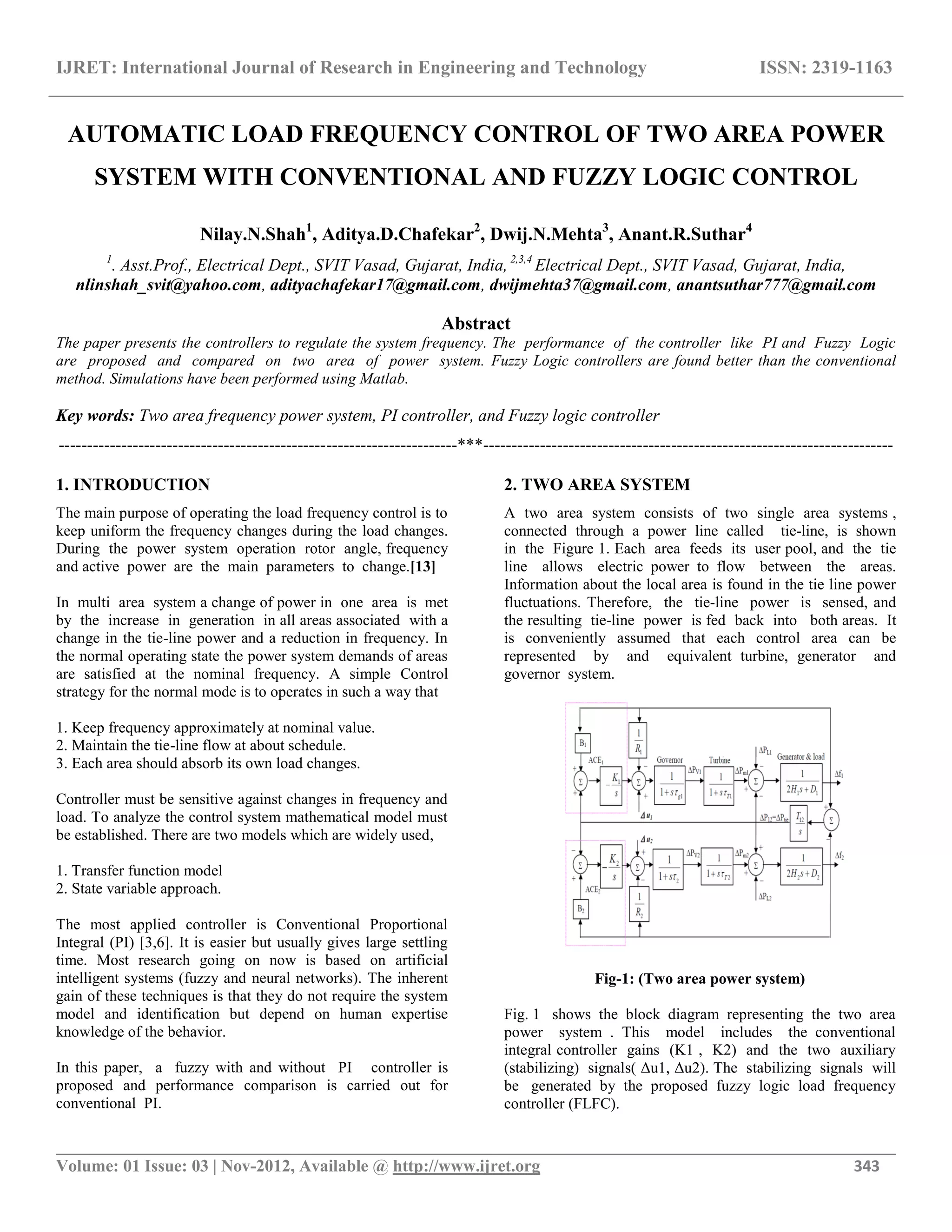 The document presents a comparison of load frequency control methods for a two-area power system using conventional PI controllers and fuzzy logic controllers. Results indicate that fuzzy logic controllers provide better dynamic responses in terms of overshoot, settling time, and steady-state error compared to conventional methods. The study concludes that fuzzy logic control offers improved performance in managing frequency changes and load variations in power systems.