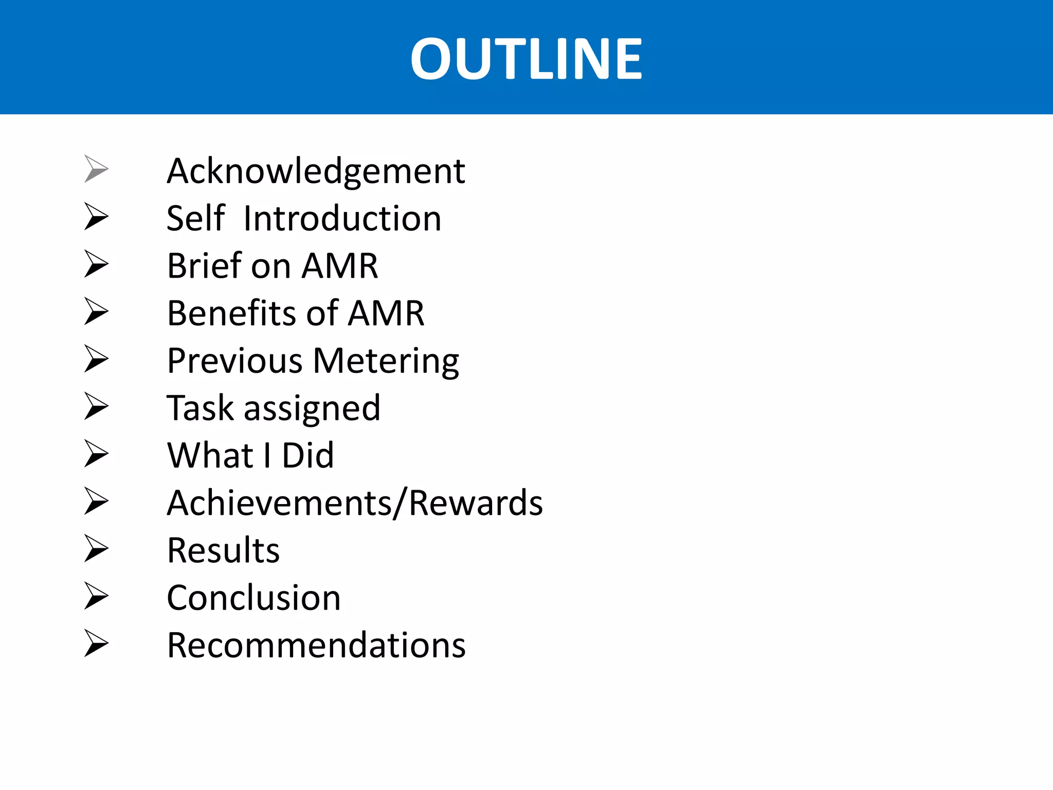 The document discusses an Automatic Meter Reading (AMR) project implemented in Islamabad, Pakistan. It provides background on AMR, describes the previous manual meter reading system, and outlines the tasks assigned to complete the AMR implementation. Key actions taken included installing and fixing defective meters, establishing a communication network, and relocating gateways. This resolved data transfer issues. Achievements included online reading without meter readers, training opportunities, and committee memberships. Results showed improved revenue collection. The conclusion emphasizes hard work, teamwork, and enhancing skills while recommendations suggest expanding AMR to more areas.
