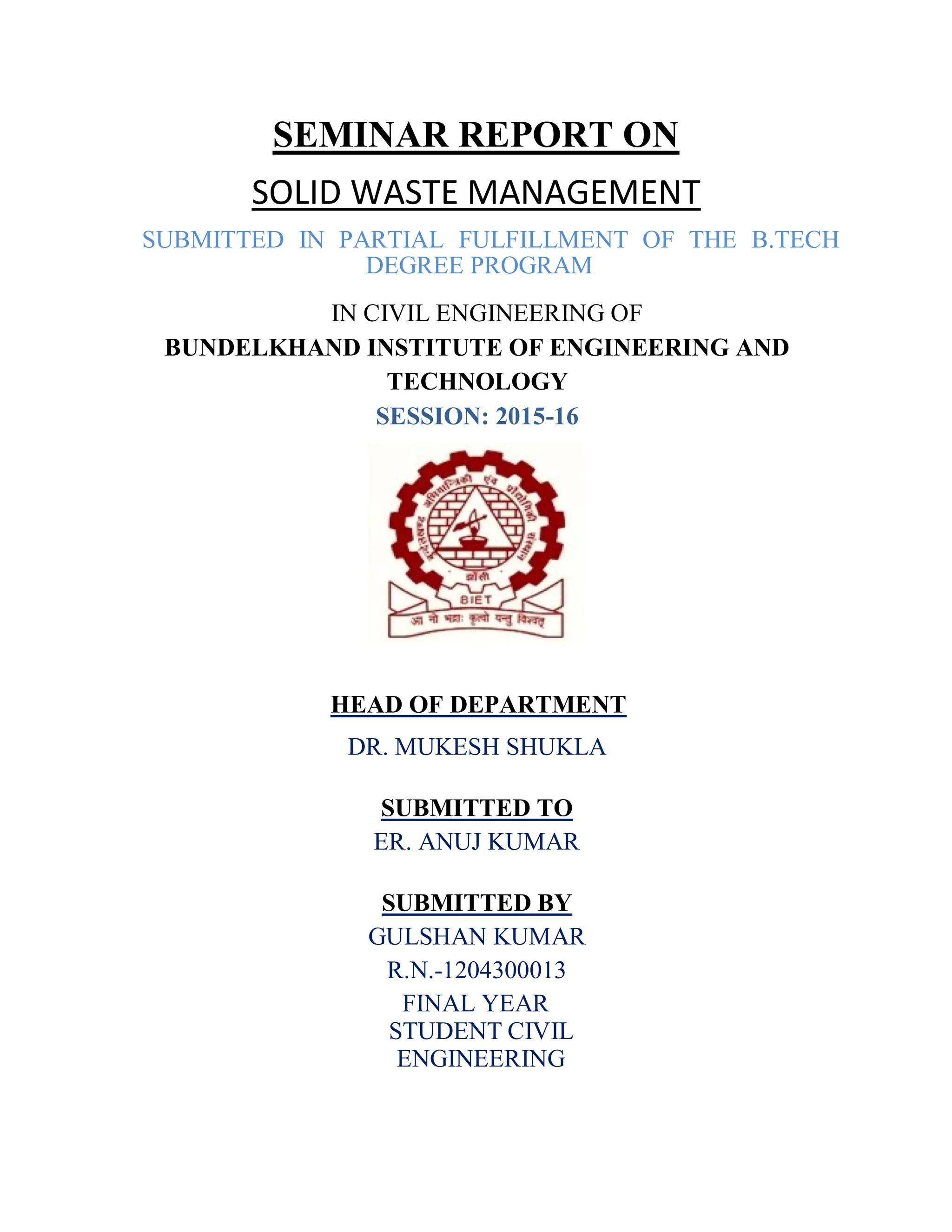 This document is a seminar report on solid waste management submitted by Gulshan Kumar to fulfill requirements for a B.Tech degree in civil engineering. It discusses the nature and generation of solid waste in India, as well as various methods for processing, treating, and disposing of solid waste including composting, vermicomposting, anaerobic digestion, incineration, and landfilling. It also covers drawbacks of current solid waste management practices and initiatives taken by state governments to improve waste handling. The report provides an overview of technologies and issues related to solid waste management in India.