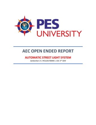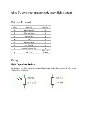 The document describes an automatic street light system using a light dependent resistor and transistor. When light falls on the LDR, its resistance decreases and the transistor switches off, turning off the LED lights. When it gets dark, the LDR's resistance increases and the transistor switches on, powering the LED lights. The system was constructed and observed to turn on the LEDs in darkness and off in light, functioning as an automatic street light control circuit.