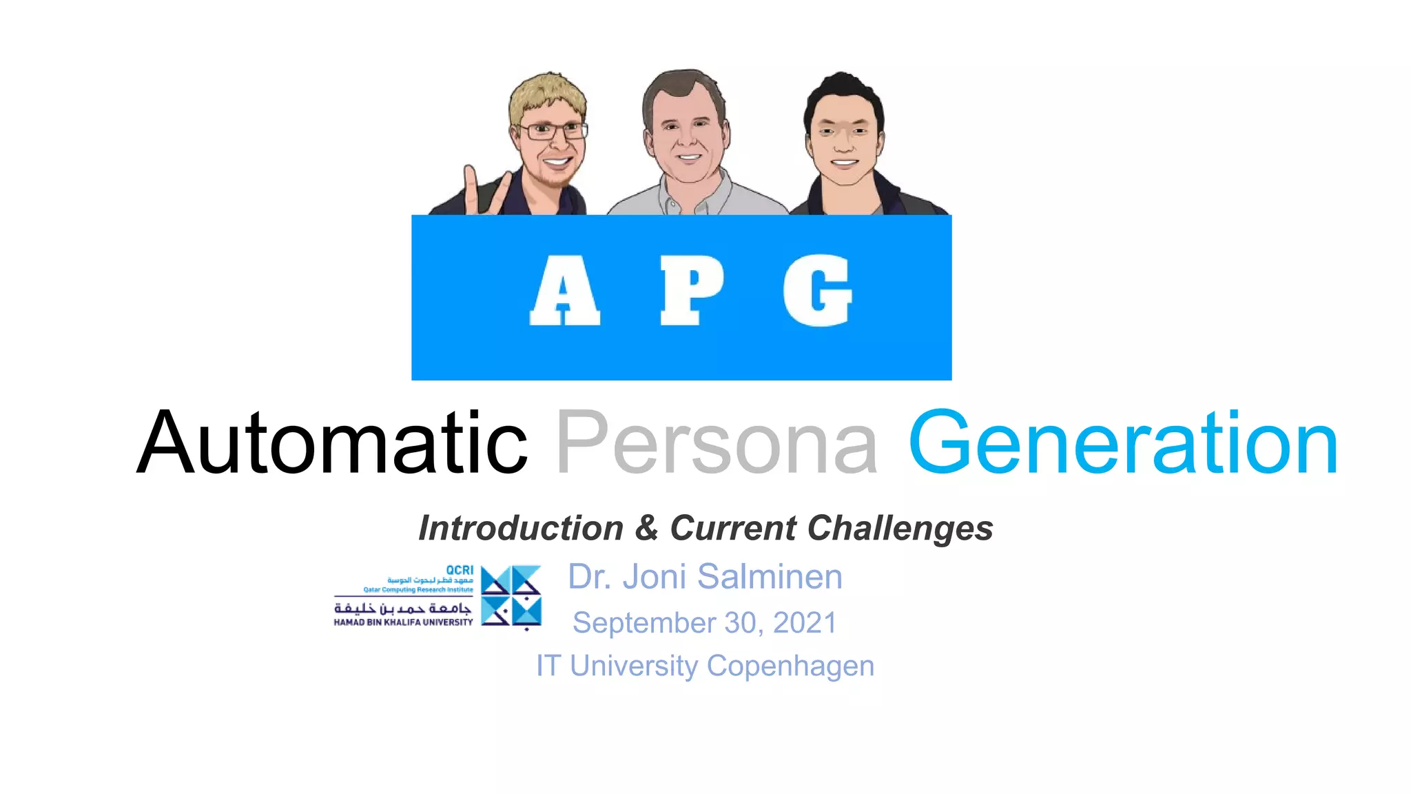 The document discusses the Automatic Persona Generation (APG) project led by Dr. Joni Salminen and his team, highlighting the advantages of automating persona creation to provide cost-effective and timely representations of user data. It outlines the history of data-driven personas and addresses current challenges related to user data interpretation, algorithmic issues, and persona validation. Through various metrics and analyses, the project aims to understand how personas influence decision-making and improve user interaction within organizations.