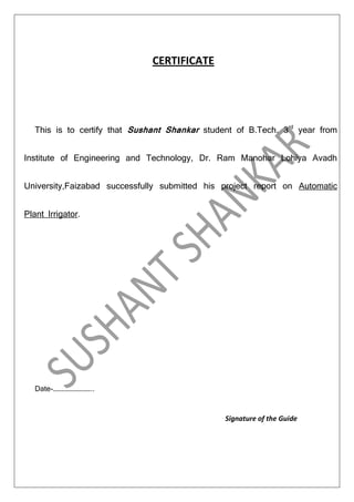This project report details the development of an automatic plant irrigation system designed to minimize manual intervention by farmers. The system uses soil moisture sensors to control a water pump, thereby optimizing water usage and efficiency in irrigation processes. It aims to address challenges such as water scarcity and unplanned water usage in agriculture through automation.