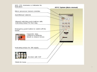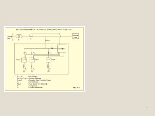 This document discusses power factor correction and automatic power factor correction (APFC) systems. It explains that power factor is the ratio of active power to apparent power and can be lagging or leading. Low power factors are caused by inductive loads and non-linear loads. APFC systems use capacitors in automatic steps controlled by a microprocessor to maintain a high power factor under varying loads without manual intervention or risk of overvoltage. This improves efficiency and reduces utility penalties and equipment loading and sizes. The document provides specifications for capacitor selection and switching equipment for APFC systems.