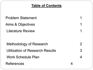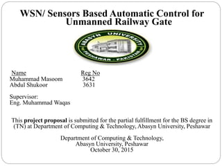 This document proposes an automatic control system for unmanned railway gates using sensors to reduce accidents. The objectives are to decrease costs by automating gates and reducing accidents through automatic closure when trains approach. The methodology uses infrared sensors to detect approaching trains and microcontrollers to signal gate motors. When a train is sensed, the system checks for vehicles near the gate before closing it, and reopens the gate once the train passes. This system could automate gates at road-rail crossings in Pakistan to improve safety.