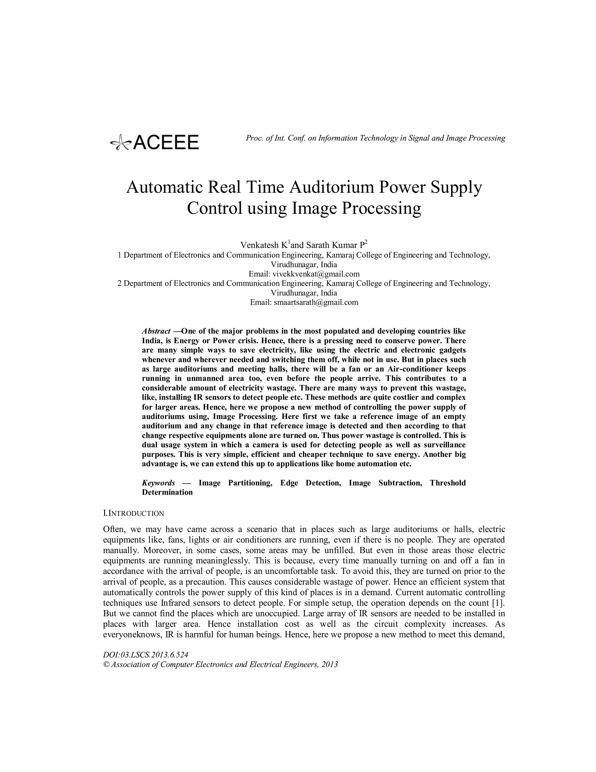 The document proposes an efficient method for controlling power supply in large auditoriums using image processing to detect human presence and minimize electricity wastage. By comparing real-time images to a reference image of an empty auditorium, the system automatically activates or deactivates lighting and fans based on occupancy, offering a cost-effective and simple solution. It highlights the advantages over traditional infrared sensors and suggests future improvements, such as face detection for enhanced flexibility.