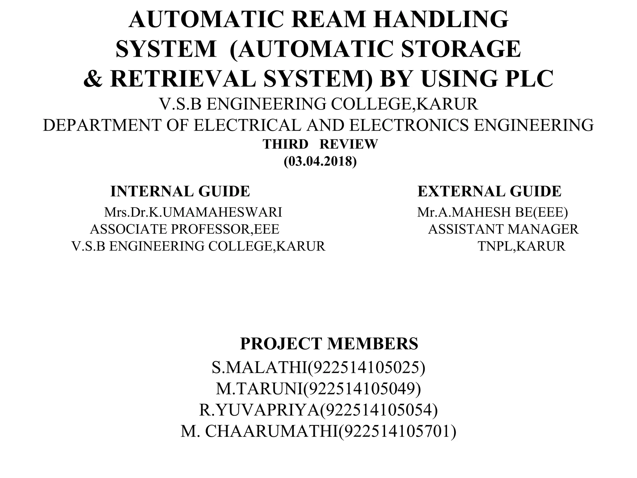 The document presents a project proposal for an automatic ream handling system using PLC at Tamil Nadu Newsprint and Paper Limited (TNPL), focusing on enhancing production efficiency by automating storage and retrieval processes. The current manual system is labor-intensive and time-consuming, whereas the proposed system aims to reduce human effort, improve accuracy, and increase productivity through automated control. Key components include PLCs, conveyors, and sensors, with a detailed simulation and programming outlined for successful implementation.