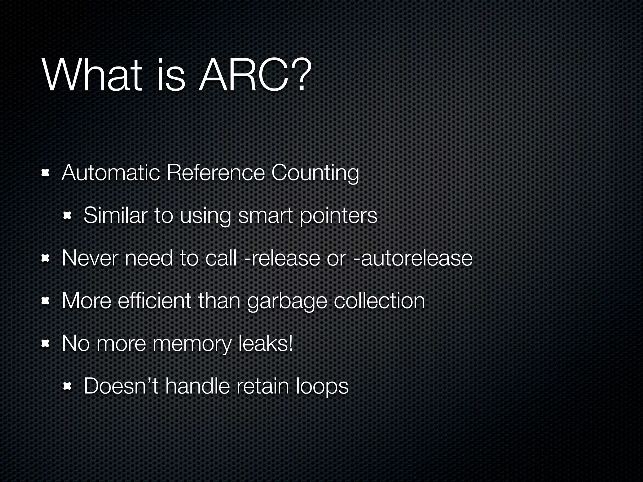 Automatic Reference Counting (ARC) simplifies memory management in Objective-C by eliminating the need for manual retain and release calls, leading to fewer memory leaks. ARC includes a weak reference system and automates deallocation, while imposing constraints on method and variable naming to ensure compatibility with manual memory management. Developers are encouraged to trust ARC to handle memory while being aware of nuances like weak referencing and lifetime qualifiers.