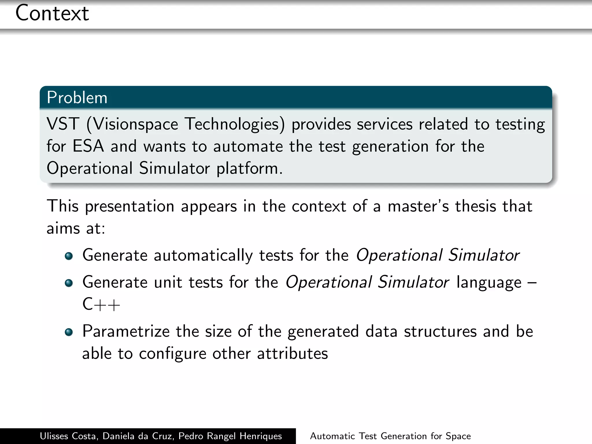 The document discusses automatic test generation for space applications. It describes a master's thesis that aims to automatically generate tests for an operational simulator using model-based and constraint-based testing. The thesis will extract UML diagrams and invariants from existing code and relate them to requirements. Tools like Korat and Pex were studied, with Korat able to generate complex data structures that satisfy invariants, while Pex can achieve high code coverage but does not maintain data structure invariants. The work will combine static analysis and data structure generation to automatically test the operational simulator.