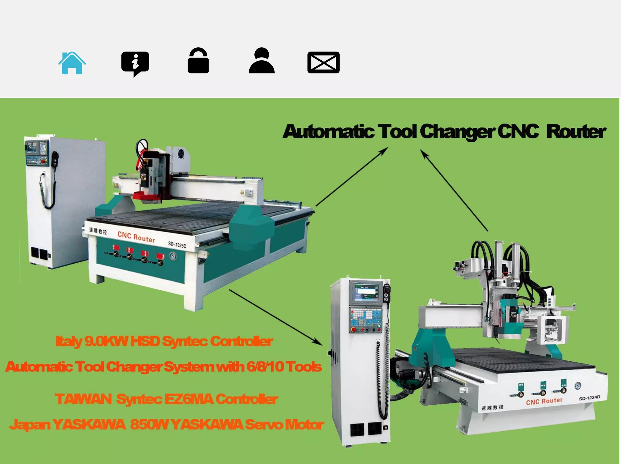 This document provides specifications for two CNC router machines. The first has a stroke range of 1220mm x 2400mm x 330mm, precision of ±0.05mm, YASKAWA 800W motors, and weighs 2000KG. The second has a 1300mm x 2500mm x 200mm stroke range, ±0.05mm precision, YASKAWA motors, and weighs 1500KG. Both machines have vacuum tables, G-code control, and are powered by 380V electricity.