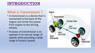 An automatic transmission is a complex system that automatically changes gear ratios without driver input, offering a smoother driving experience compared to manual transmissions. It consists of various components including mechanical, hydraulic, electrical systems, and computer controls that work together to manage power transfer from the engine to the wheels. The document also details the differences between rear-wheel and front-wheel drive setups and emphasizes the advantages of automatic vehicles, particularly for older drivers due to their ease of use and lower collision risks.