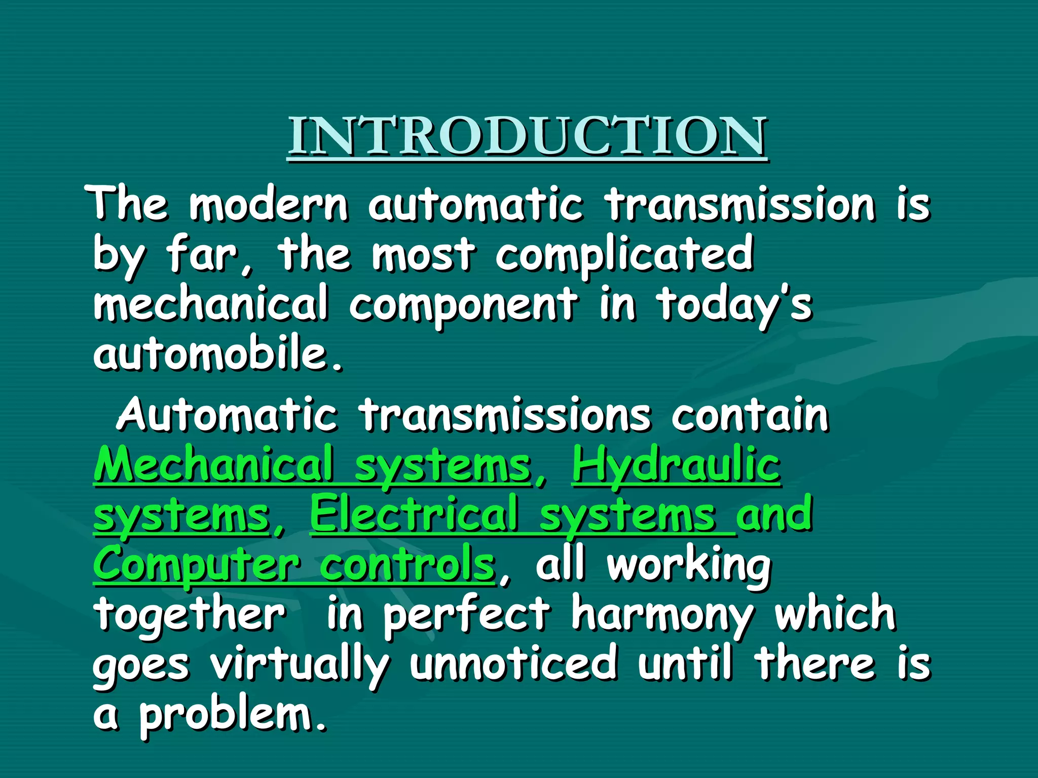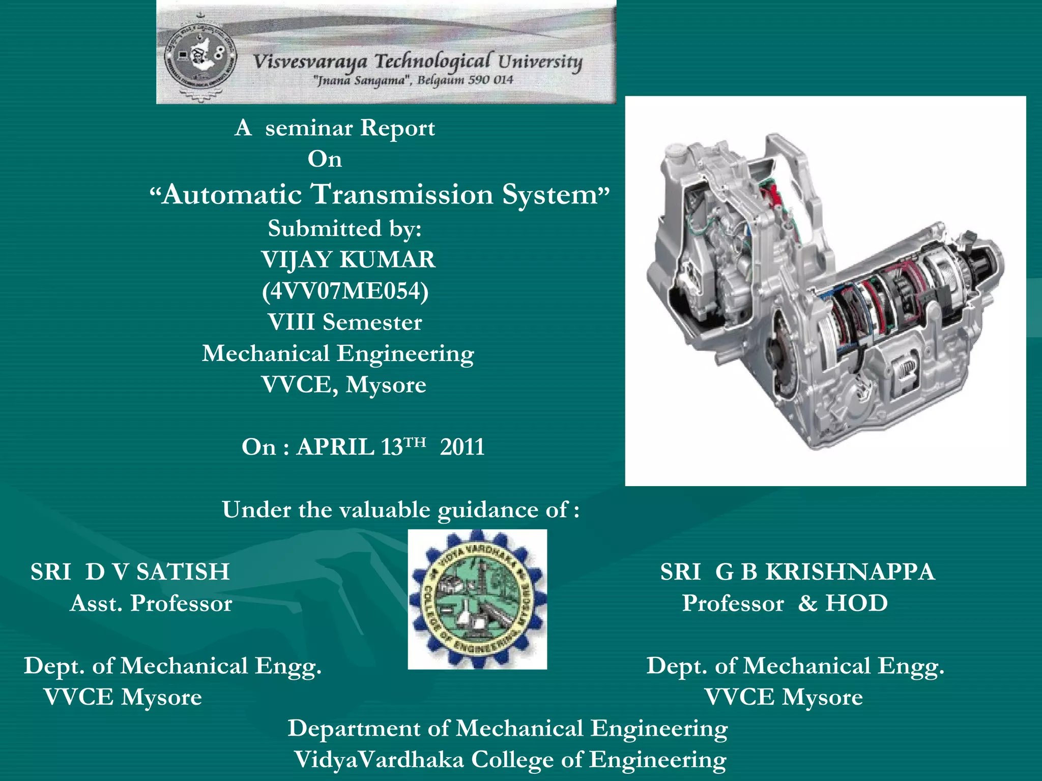 This document is a seminar report on automatic transmission systems submitted by Vijay Kumar, an 8th semester mechanical engineering student at VVCE Mysore. It discusses the key components of automatic transmissions including planetary gear sets, hydraulic systems, torque converters, clutches, bands and computer controls. It also covers rear-wheel drive and front-wheel drive transmissions, common problems, and repair options. The conclusion emphasizes the importance of keeping transmissions and fluid at the proper operating temperature for long life. References include technical websites and manuals.