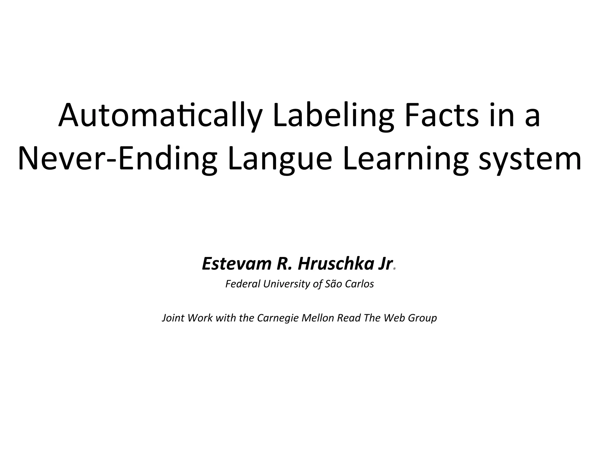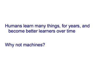 The document discusses 'NELL' (Never-Ending Language Learner), an AI system designed to continuously acquire knowledge and improve its language comprehension by extracting facts from the web and interacting with human trainers. NELL operates 24/7, validating its knowledge through human supervision, querying, and hiring labelers via services like Mechanical Turk. The system aims to evolve through conversational learning, enhancing its question-answering capabilities and knowledge base over time.