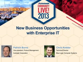The document discusses the changing landscape of enterprise IT, highlighting challenges faced by CIOs who are pressed to do more with fewer resources while aligning IT with business objectives. It emphasizes the advantages of Autotask in addressing the needs of these organizations, particularly those with 10-50 IT staff, and presents various models for partners to leverage Autotask for revenue generation. The document concludes with an encouragement to engage potential clients within existing customer bases to adapt to the evolving market demands.