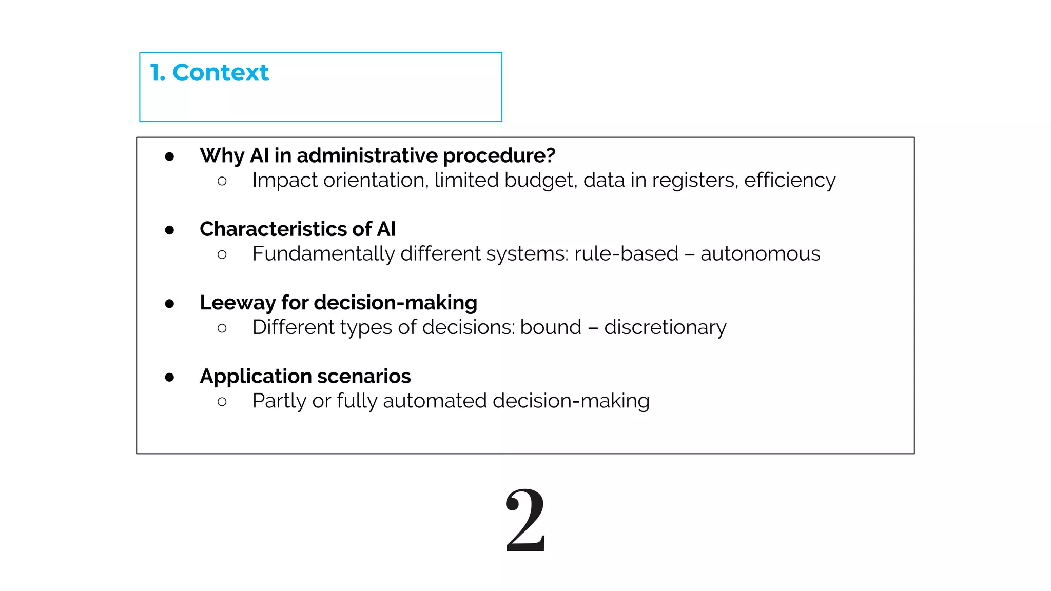 This document discusses the use of artificial intelligence in administrative procedures in light of GDPR Article 22. It outlines some key characteristics of AI systems and different types of automated decision-making. It examines scenarios where AI could be used, such as automated positive decisions for income tax or family allowance. It also discusses the requirements for fully automated administrative acts under German law, and implications for other legal systems. Specifically, it notes the need to ensure the right to obtain human intervention, express views, and contest decisions when AI is used for profiling or automated decisions under GDPR Article 22.