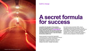 Accenture recognized the need to transform its procurement operations to focus on driving real value. It renamed the procurement organization to "Procurement Plus" and set about reimagining the function. Accenture introduced intelligent automation technologies like RPA, NLP and virtual agents to over 30% of its processes, reducing costs by 25% over three years while increasing capacity by 10% annually. To scale benefits enterprise-wide, Accenture adopted an integrated approach, eliminating silos, increasing automation visibility and enabling performance management. This included transitioning automations to a centralized global IT team for ongoing maintenance and development. Key benefits included reduced hardware/license costs and increased security, speed and scalability.