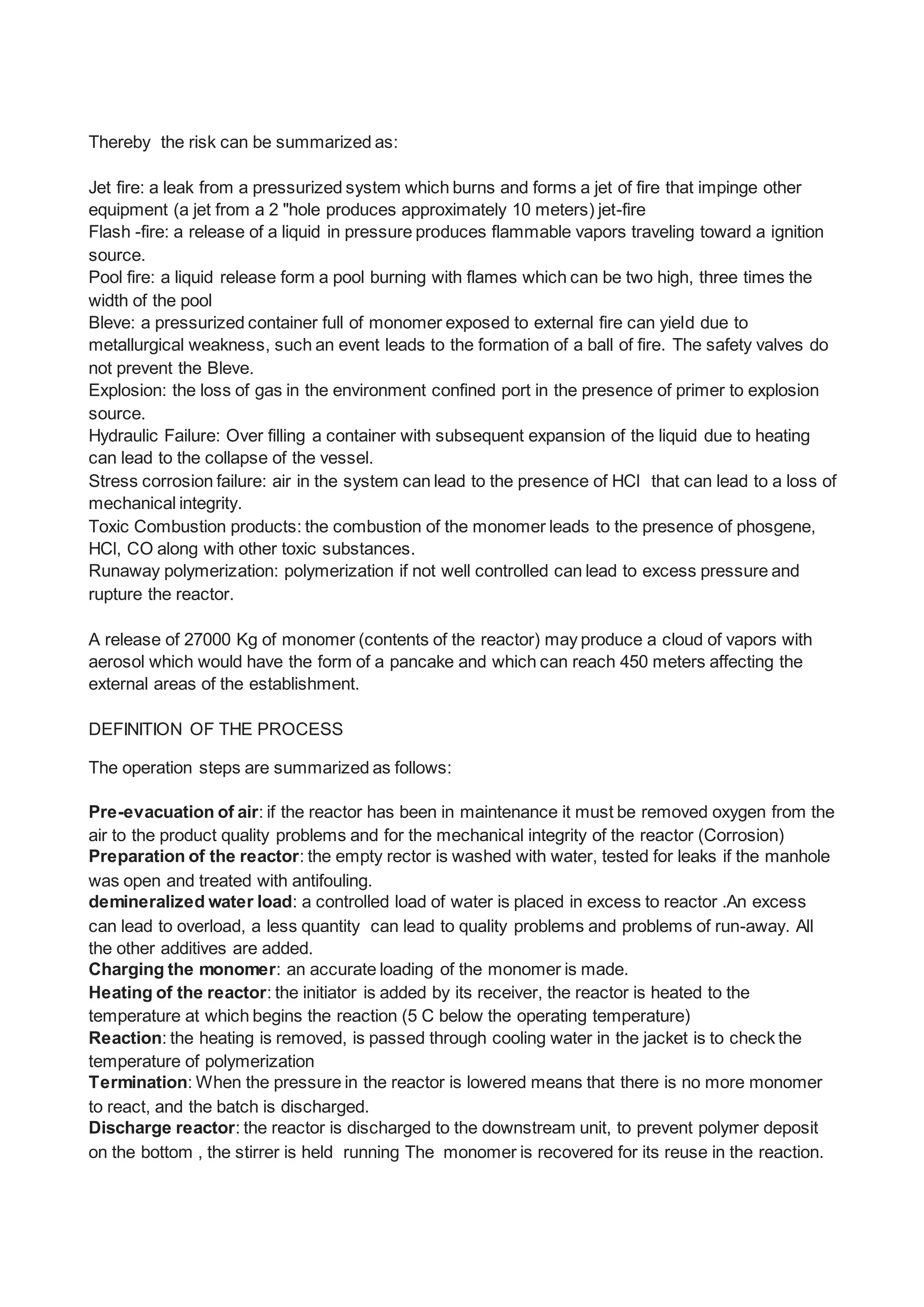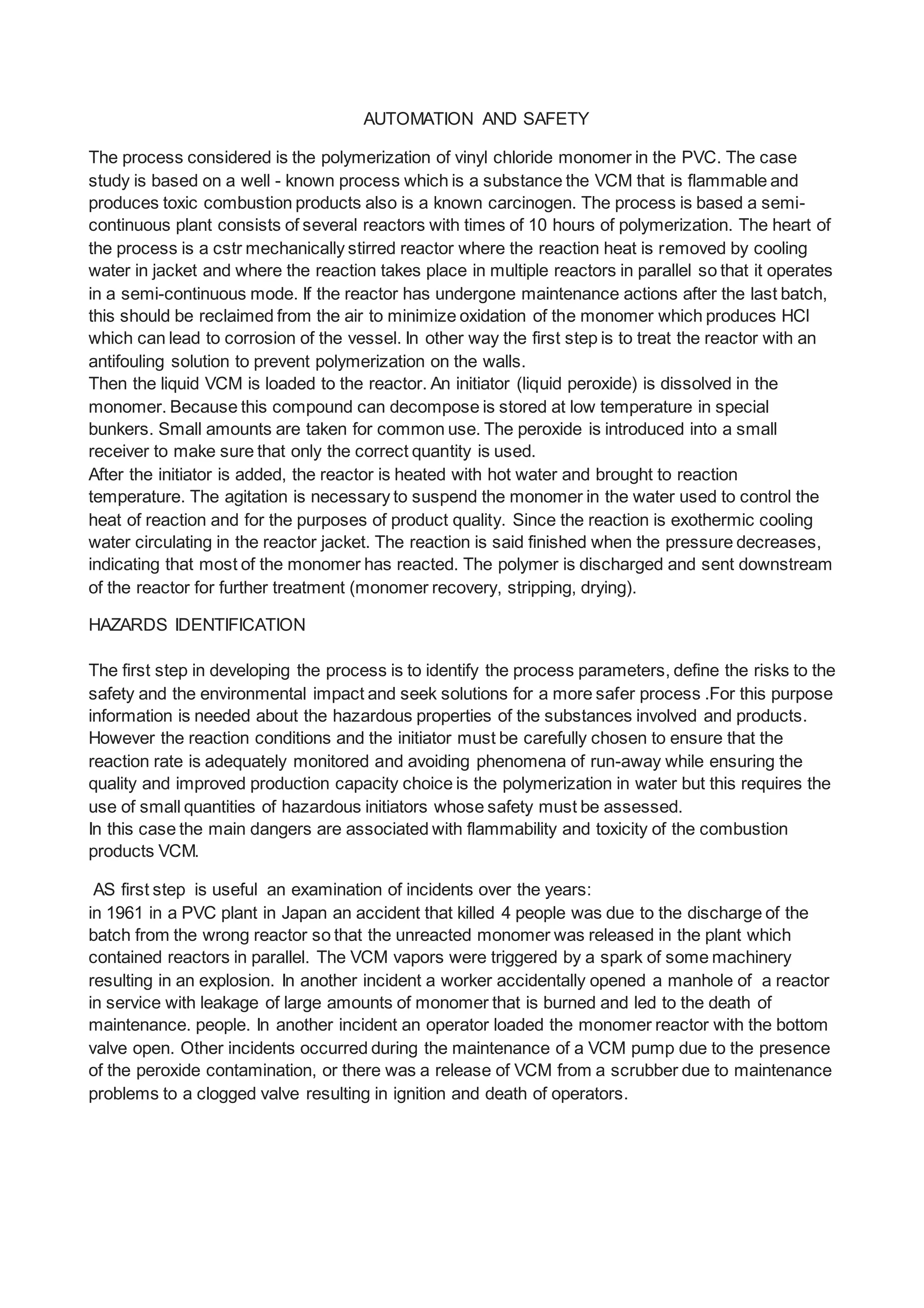 The document discusses automation and safety considerations for the polymerization of vinyl chloride monomer (VCM) in polyvinyl chloride (PVC) production. VCM is flammable and toxic, and the exothermic polymerization reaction must be carefully controlled to prevent runaway reactions. Hazards include fires, explosions, and toxic emissions. A hazard assessment identifies scenarios like cooling failure, overfilling, and loss of agitation that could lead to runaway. Prevention strategies include alarms, addition of chemical inhibitors, and automatic depressurization of reactors in emergencies.