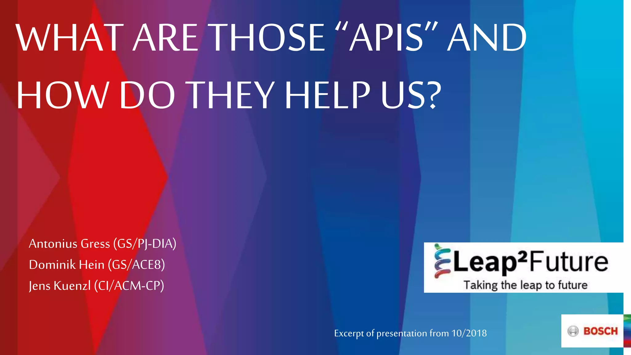 An API is an application programming interface that allows programs to request services from operating systems, software libraries, or other services. APIs standardize how different software applications interact, enabling communication between multiple platforms. The presentation discusses how APIs can help address issues like data silos, reduce costs from automation that relies on graphical user interfaces, and enable end-to-end process automation. Examples are given showing how Amazon transformed into a services-first company by requiring teams to expose data and functionality through APIs, and how Bosch has used APIs between systems to reduce manual work and errors.