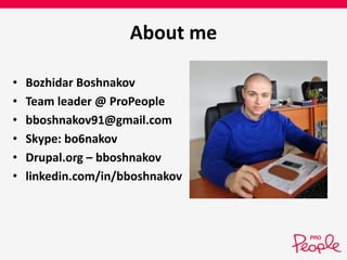 This document discusses automation testing for Drupal using behavior-driven development. It introduces test-driven development (TDD) and behavior-driven development (BDD) approaches. Key frameworks discussed include Gherkin for writing tests in a business-readable format, Behat as a BDD framework, and Mink for browser emulation. The Drupal extension is also covered, which adds Drupal-specific steps and functionality to Behat.